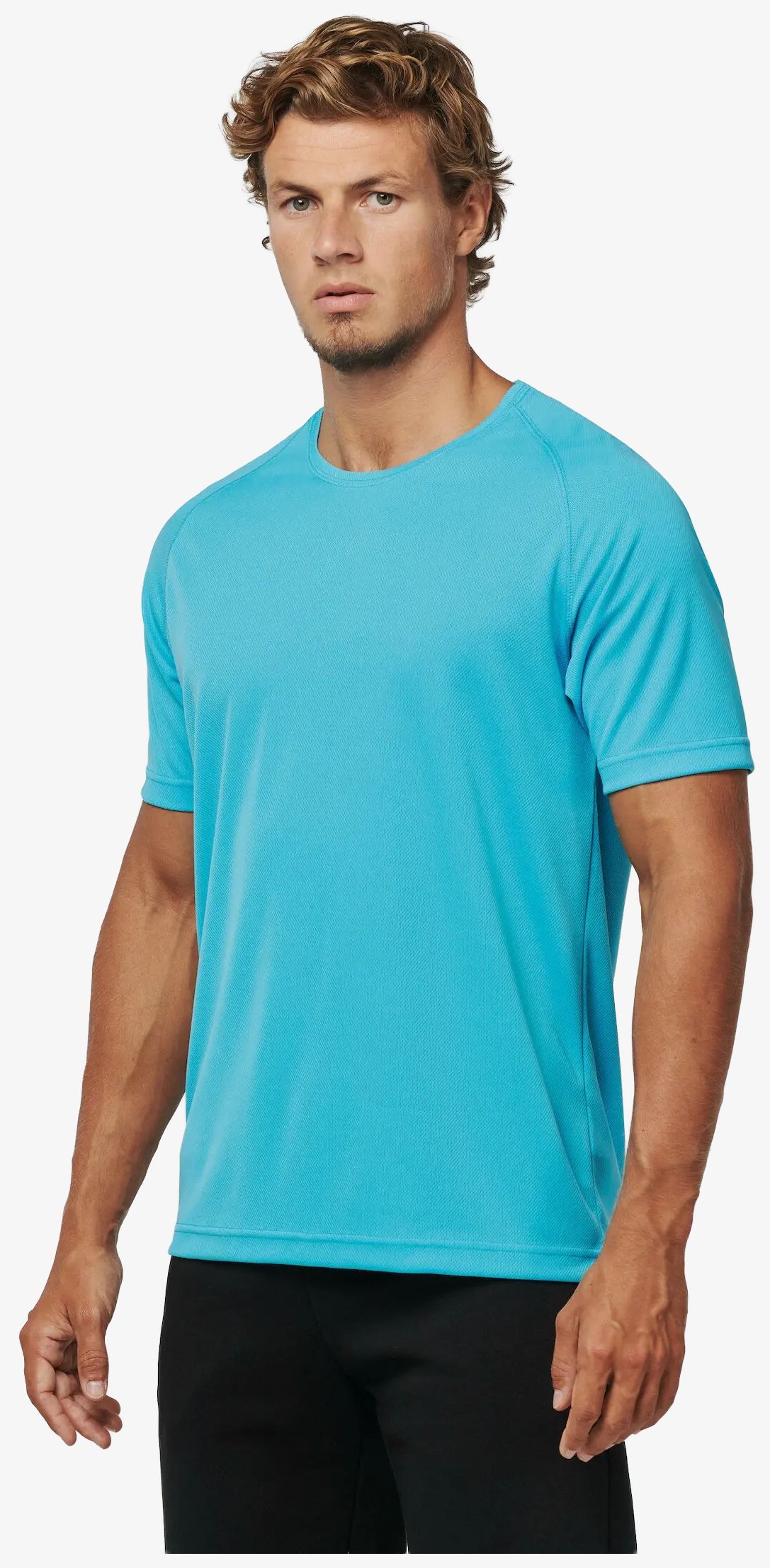 Le tee-shirt sport manches courtes homme est conçu en tissu léger à séchage rapide et respirant. Il présente une encolure ronde avec bande de propreté et des manches raglan. Les finitions comprennent une double aiguille à l'encolure ainsi qu'au bas des manches.