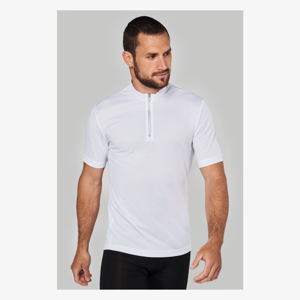 T-shirt cycliste manches courtes : 100% polyester. Tissu léger à séchage rapide. Col cheminée fermé avec un zip réfléchissant. Dos plus long pour une meilleure couverture dorsale. Poche arrière et zip réfléchissant + passe-fil pour mp3. Grammage : 160g/m²