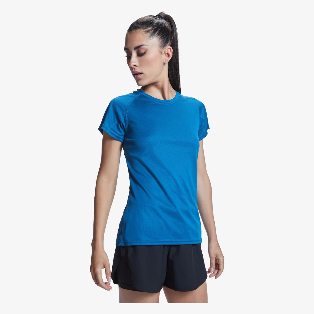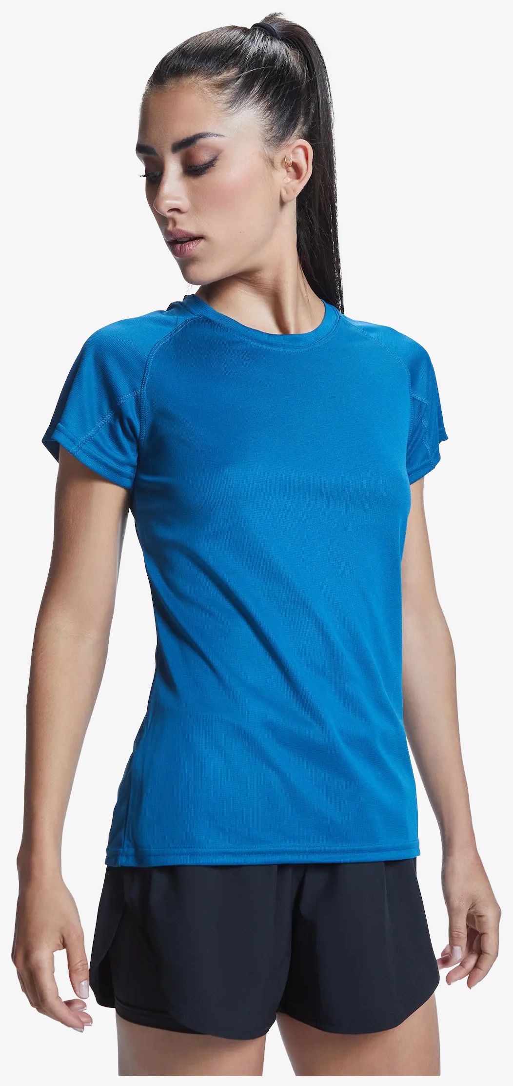 Le tee-shirt technique manches courtes raglan pour femme présente un col rond avec bande de propreté ton sur ton et des panneaux inférieurs sur les manches. Les coutures ton sur ton sont situées sur les emmanchures et les panneaux manches. Le tissu CONTROL DRY compose ce modèle.