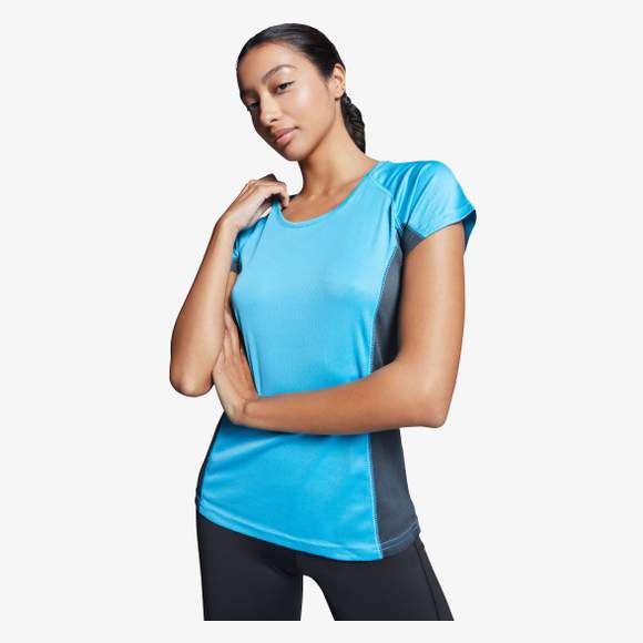 Le tee-shirt Shanghai Woman associe deux tissus polyester, avec un tissu principal bird's eye et des panneaux latéraux en tissu micro perforé dans l'intérieur des manches. Il présente des manches courtes raglan et un col rond avec bande propreté renforcée à l'intérieur. Ce tee-shirt moulant est conçu pour être confortable et adapté à la transpiration.