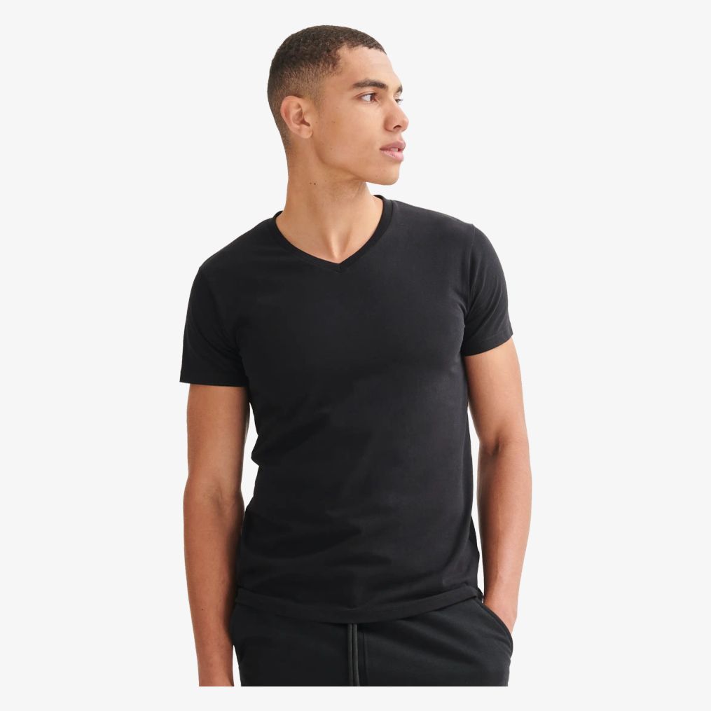 Le tee-shirt stretch col V pour homme associe coton et élasthanne pour une certaine souplesse et un confort adapté. Il présente une coupe longue moderne ainsi qu'une étiquette détachable qui facilite son usage.