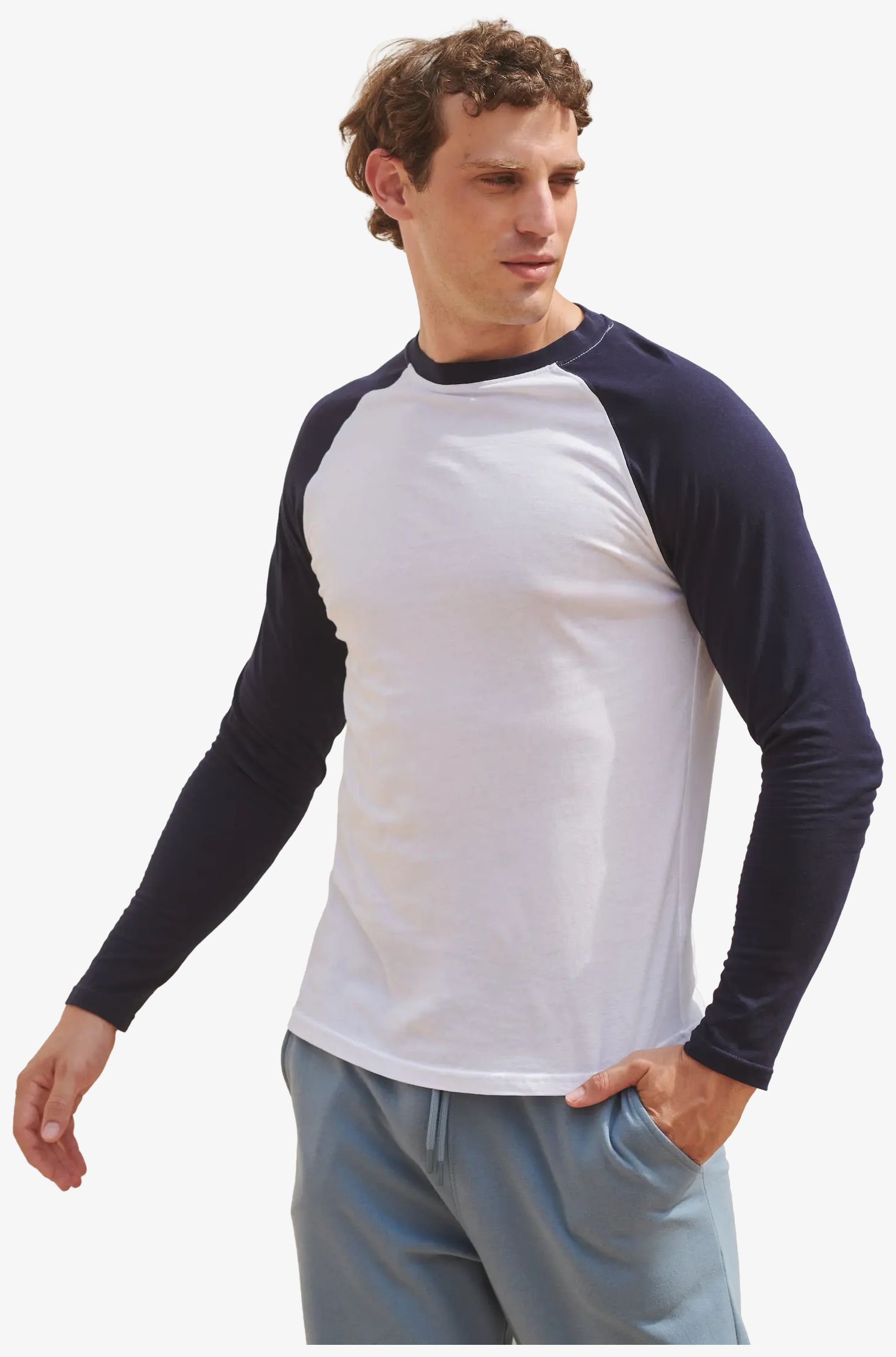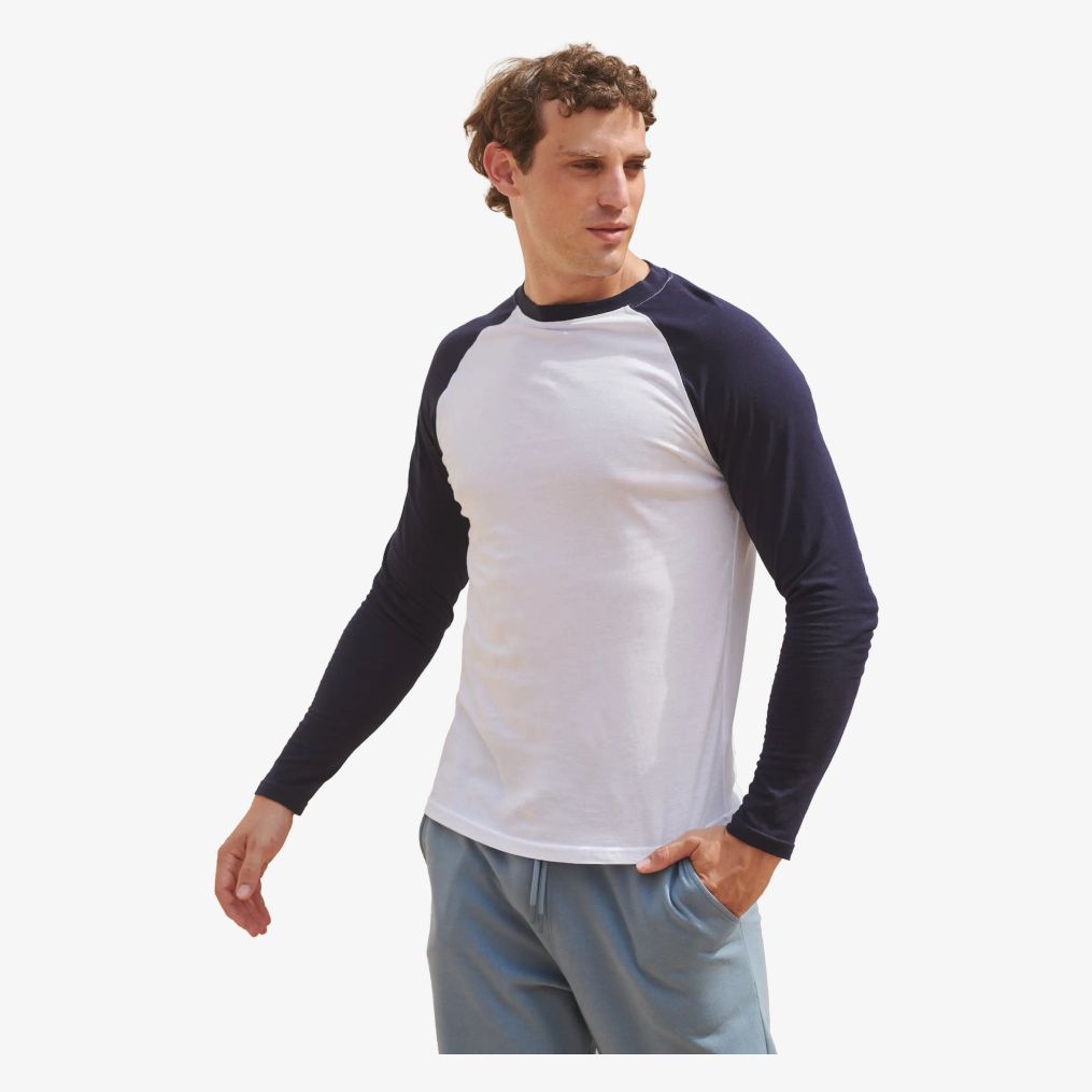 Le tee-shirt manches longues baseball présente un col manches raglan contrastés et un col bords côte. La double piqûre à l'ourlet apporte une finition soignée. L'étiquette est détachable. La composition est 100% coton sauf pour le coloris heather grey qui comprend 85% coton et 15% viscose.