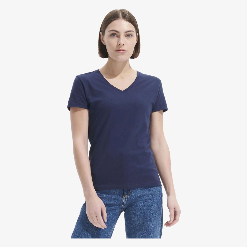 Le tee-shirt col V pour femme est confectionné en jersey 190, composé de coton semi-peigné Ringspun. Il dispose d'une bande de propreté au col et d'un col bord côte en V. Les manches sont courtes et le tee-shirt est coupé cousu.