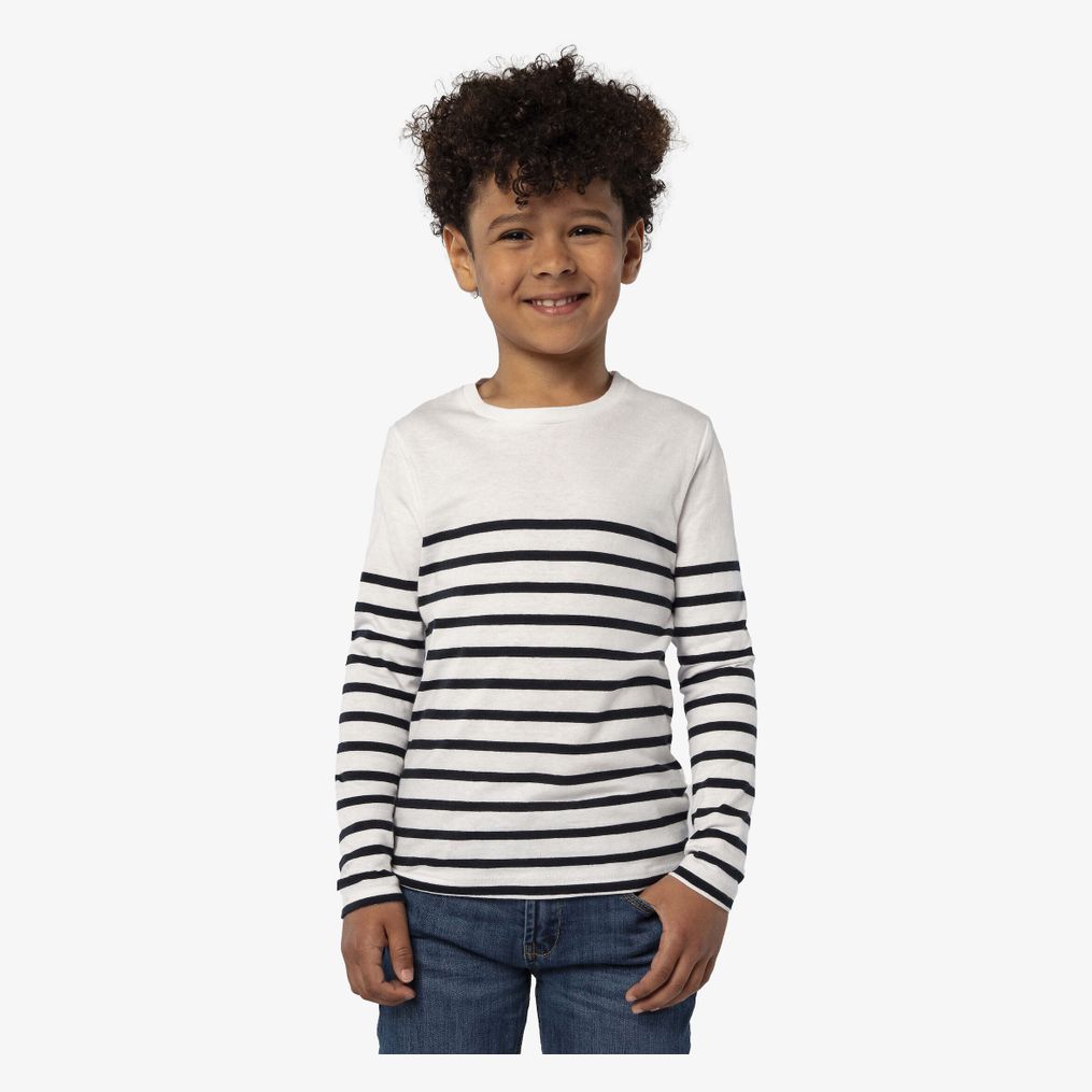 Le tee-shirt enfant manches longues Matelot LSL Kids présente des rayures placées, un col rond et une coupe droite. Il est coupé cousu et confectionné en 100% coton peigné Ringspun avec un traitement d'enzyme pour un toucher plus doux.