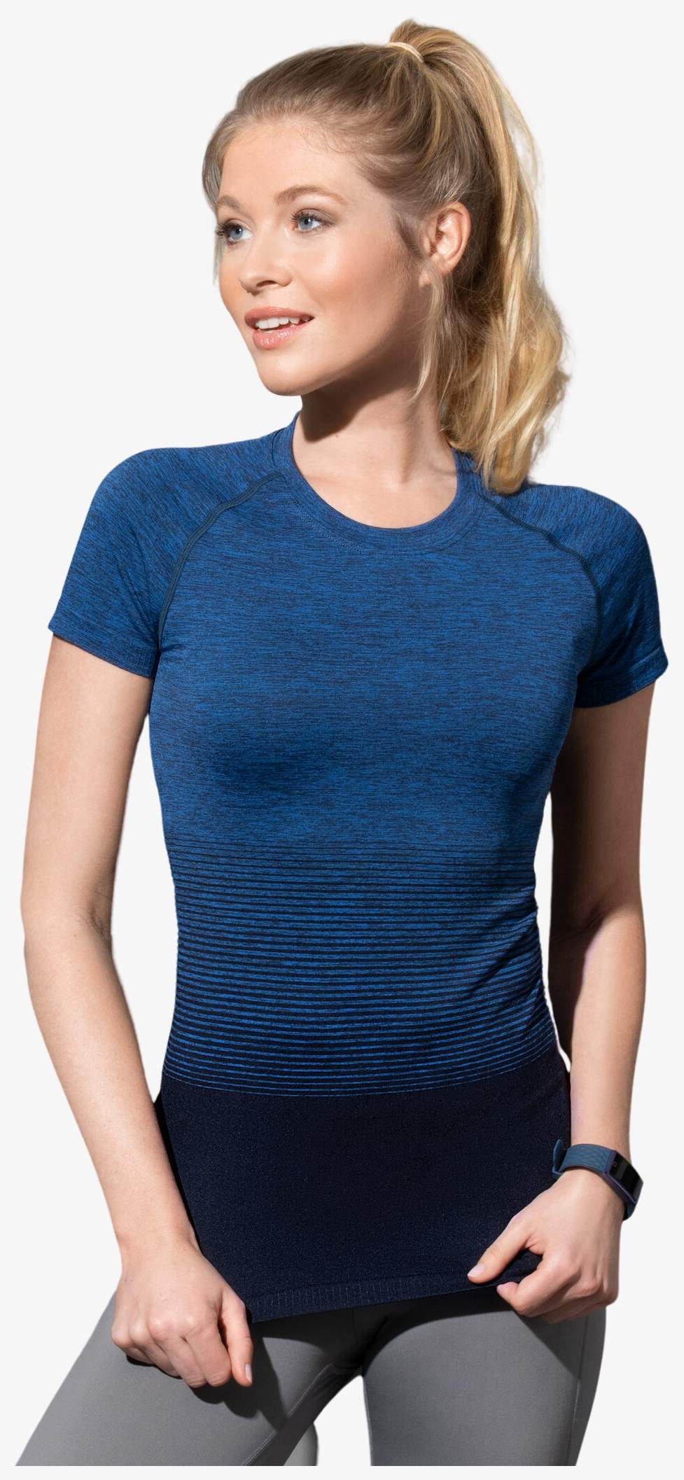 Le tee-shirt sport manches raglan pour femmes combine un tissu à séchage rapide et une élasticité élevée. Il présente un motif dégradé multicolore avec des coutures flatlock et un col fin dans la même matière. La confection tubulaire ajoute à sa structure.