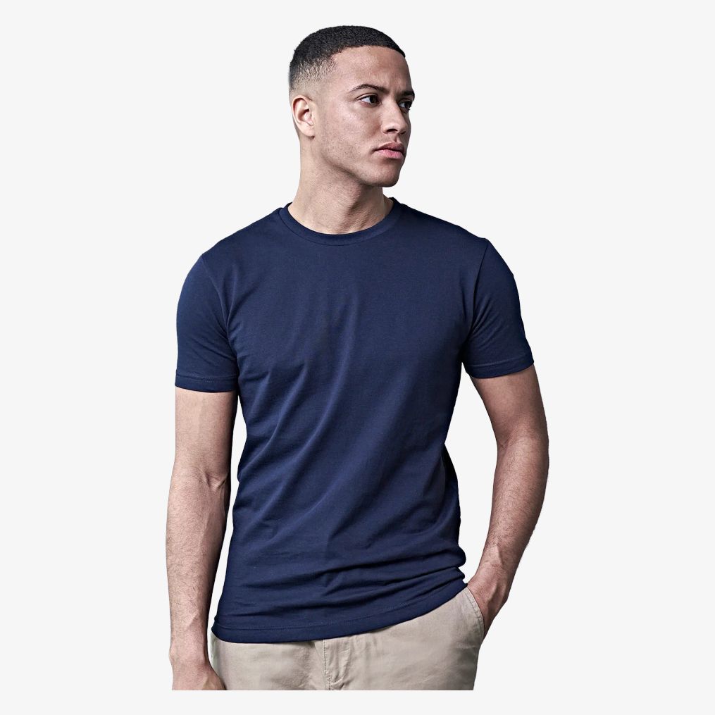 Le tee-shirt coupe slim présente un col en double épaisseur avec élasthanne. Il est fabriqué en coton longues fibres pré-rétréci et 100% coton ring spun peigné.