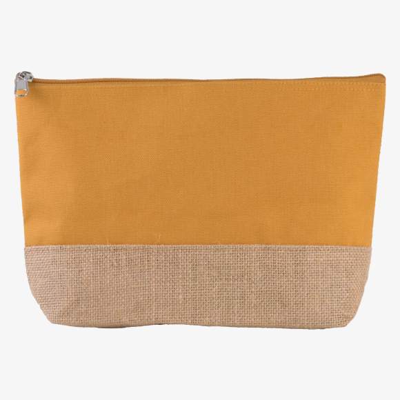 La pochette toile coton avec base contrastée en jute naturelle laminée combine deux matériaux distincts. Ses dimensions sont de 27 cm x 5 cm x 18 cm et elle dispose d'une capacité de 3 litres.