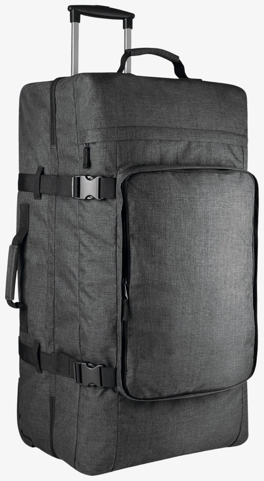 Grand sac trolley à double compartiment en polyester 600D. Panneau avant amovible pour faciliter la personnalisation. Dimensions : 41x34x79 cm.