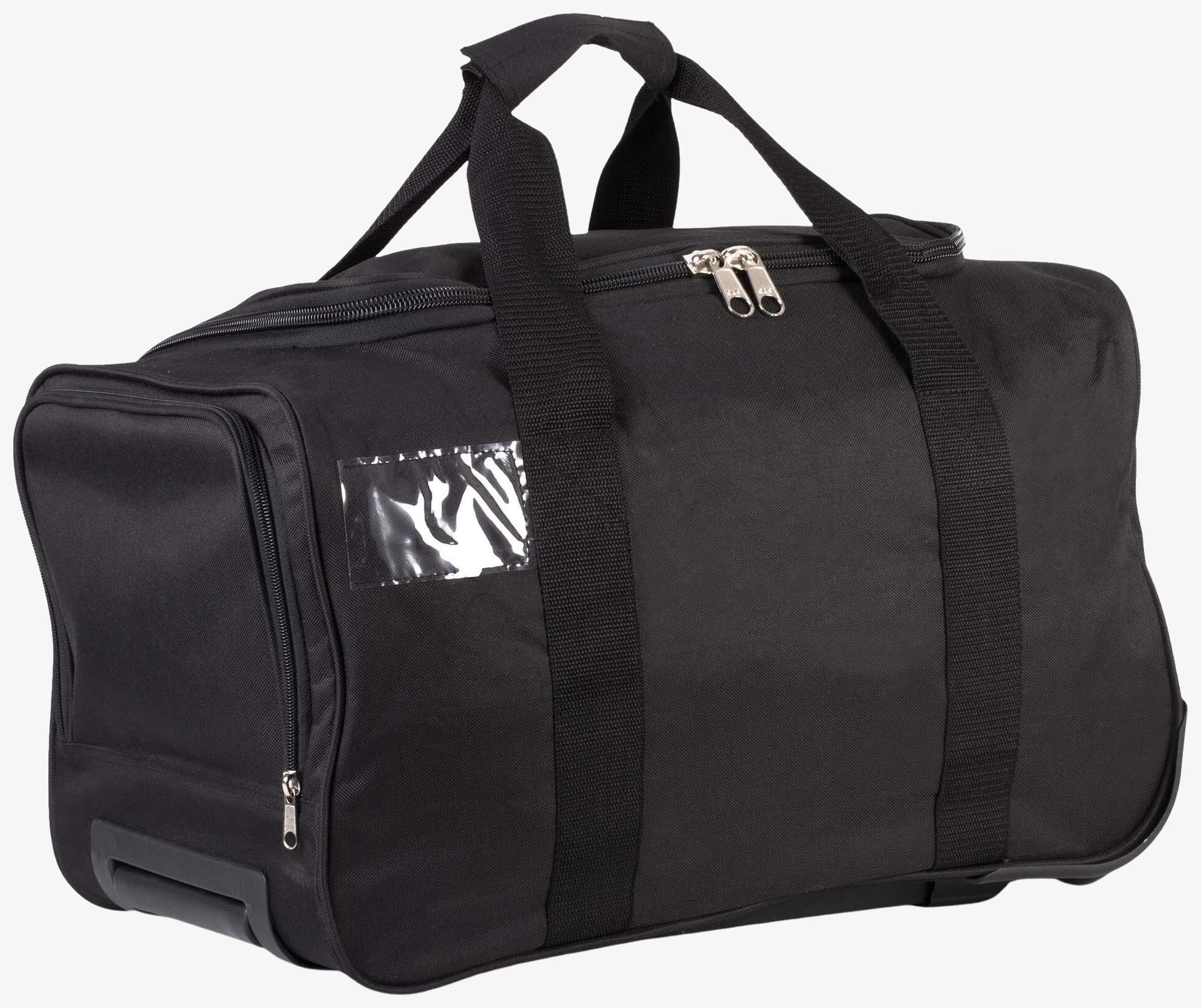 Le sac sport trolley est conçu en polyester 600D avec un système trolley intégré. Il dispose d'une grande ouverture supérieure avec un large zip et d'une poche latérale zippée destinée à accueillir une paire de chaussures. Il comprend aussi un porte-étiquette pour identification et des poignées sangle renforcées avec lanières de 5 cm autour.