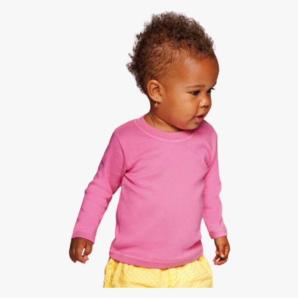 Le Baby Longsleeve Top tee-shirt manches longues set-in avec bord élastiqué à l\"encolure et 2 boutons-pression sans nickel à l\"épaule gauche. Coutures latérales et couture décorative à l\"encolure, aux manches et à la base.