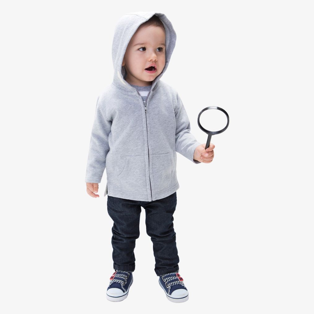 Le sweat à capuche pour bébé comprend un zip avant, une poche kangourou et des faux cordons de serrage. L'étiquette est amovible. La composition est de 80% coton et 20% polyester.