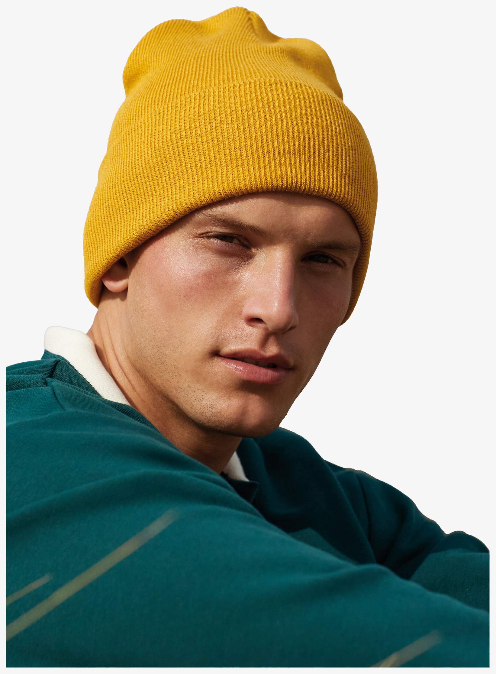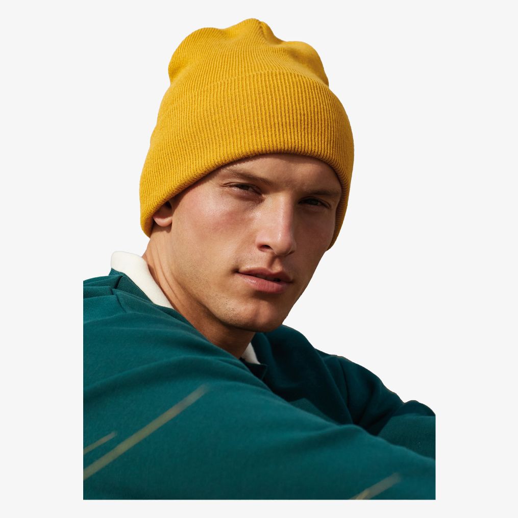 O gorro de malha dupla camada é concebido com uma aba larga para decoração otimizada. Disponível em tamanho único com etiqueta destacável. O material contém pelo menos 50% de poliéster reciclado.
