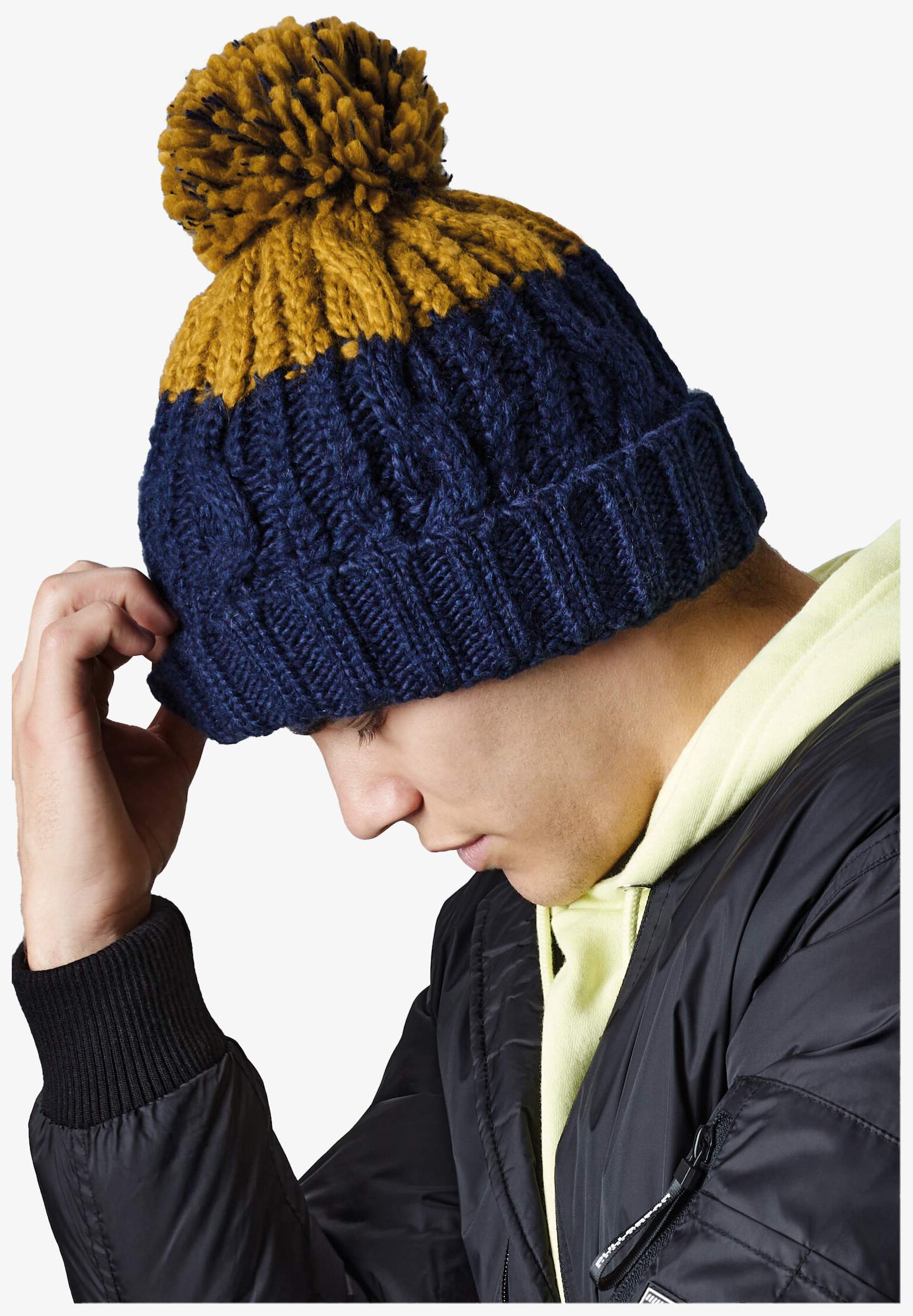 O gorro de malha torcido grosso é fabricado com vários fios e um pompom. Inclui uma faixa térmica imitação carneiro para isolamento adicional. O modelo bicolor possui design com dobra.