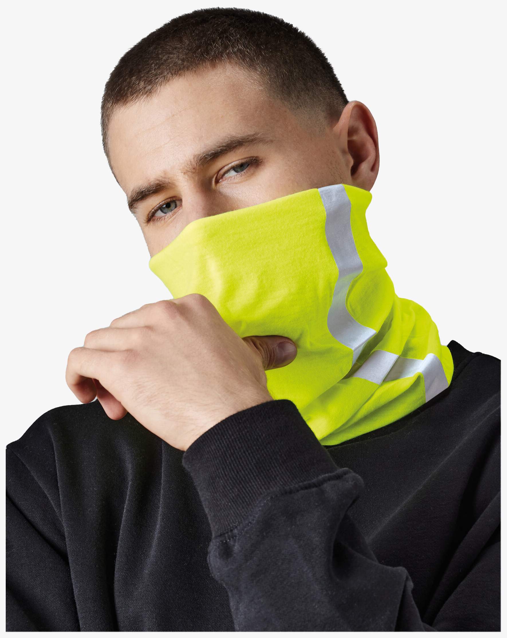 O lenço tubular incorpora bandas refletoras e tecido sem costuras para maior conforto. É feito de tecido respirável. Este modelo não bloqueia infecções ou transmissões virais.