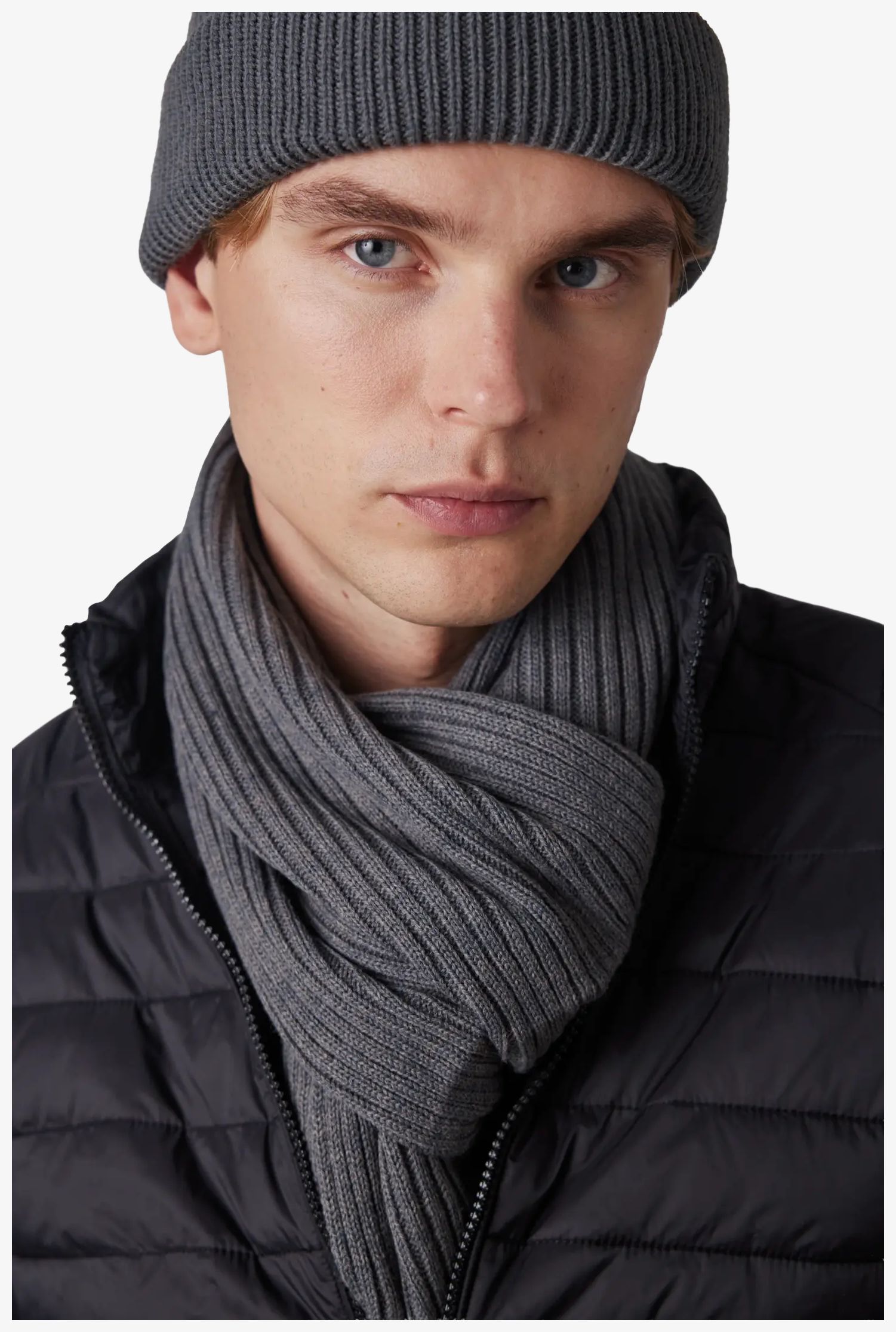 O cachecol de malha canelada combina suavidade e conforto graças a uma fibra sintética concebida para limitar seu impacto ambiental. Utiliza um fio Polylana®, uma alternativa ao acrílico com produção que necessita menos energia e água.