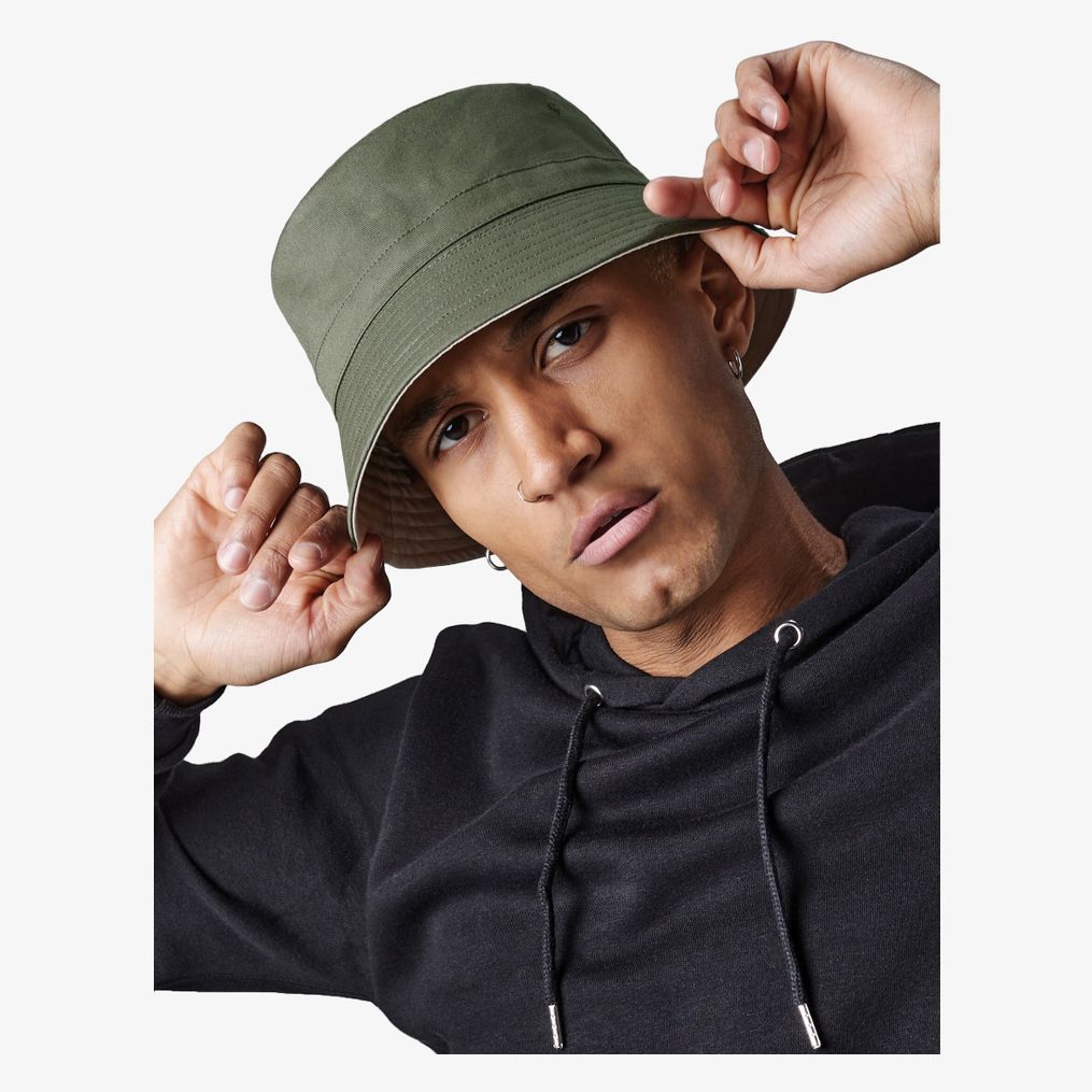 O bob réversible é feito em algodão twill com topo plano e orifícios de ventilação bordados na aba curta. A etiqueta de tecido adesiva é removível para maior conforto.