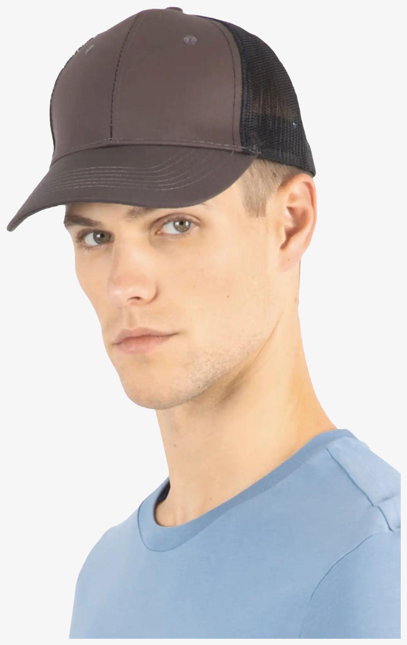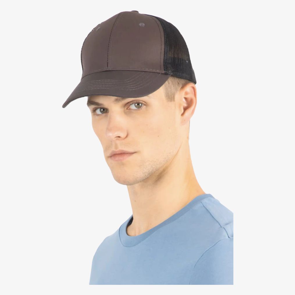 O boné trucker possui 6 painéis com aba de perfil médio e painéis frontais reforçados tom sobre tom.
