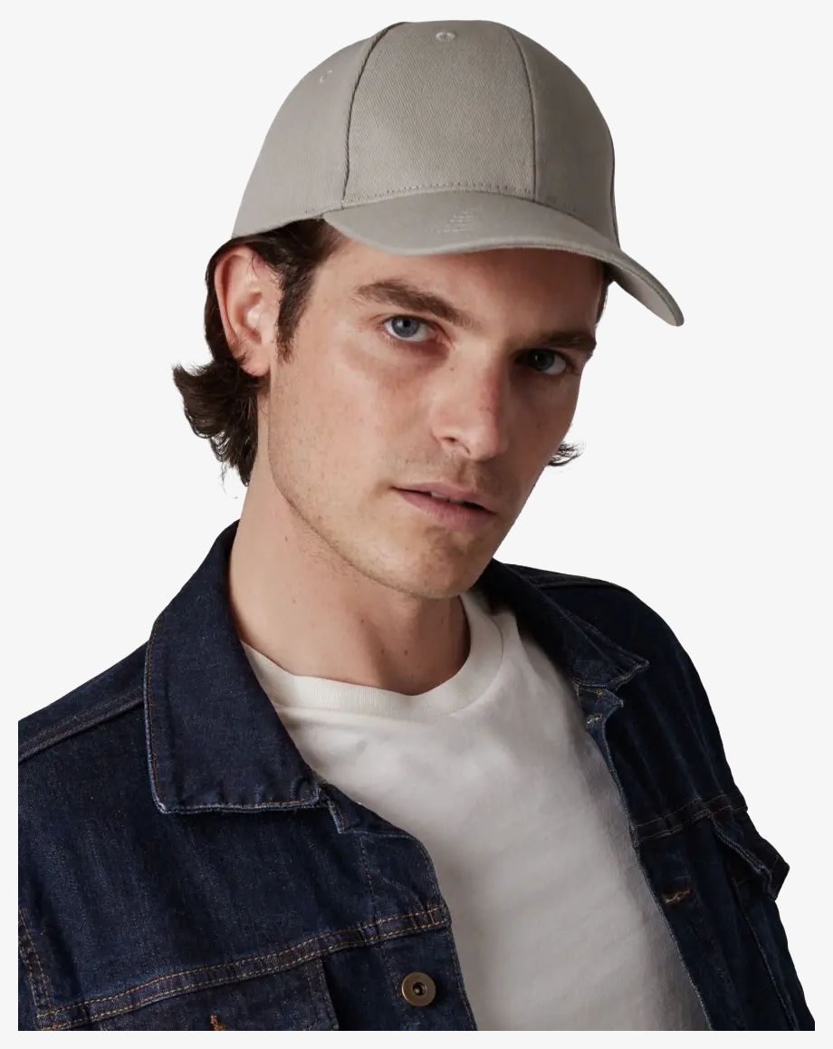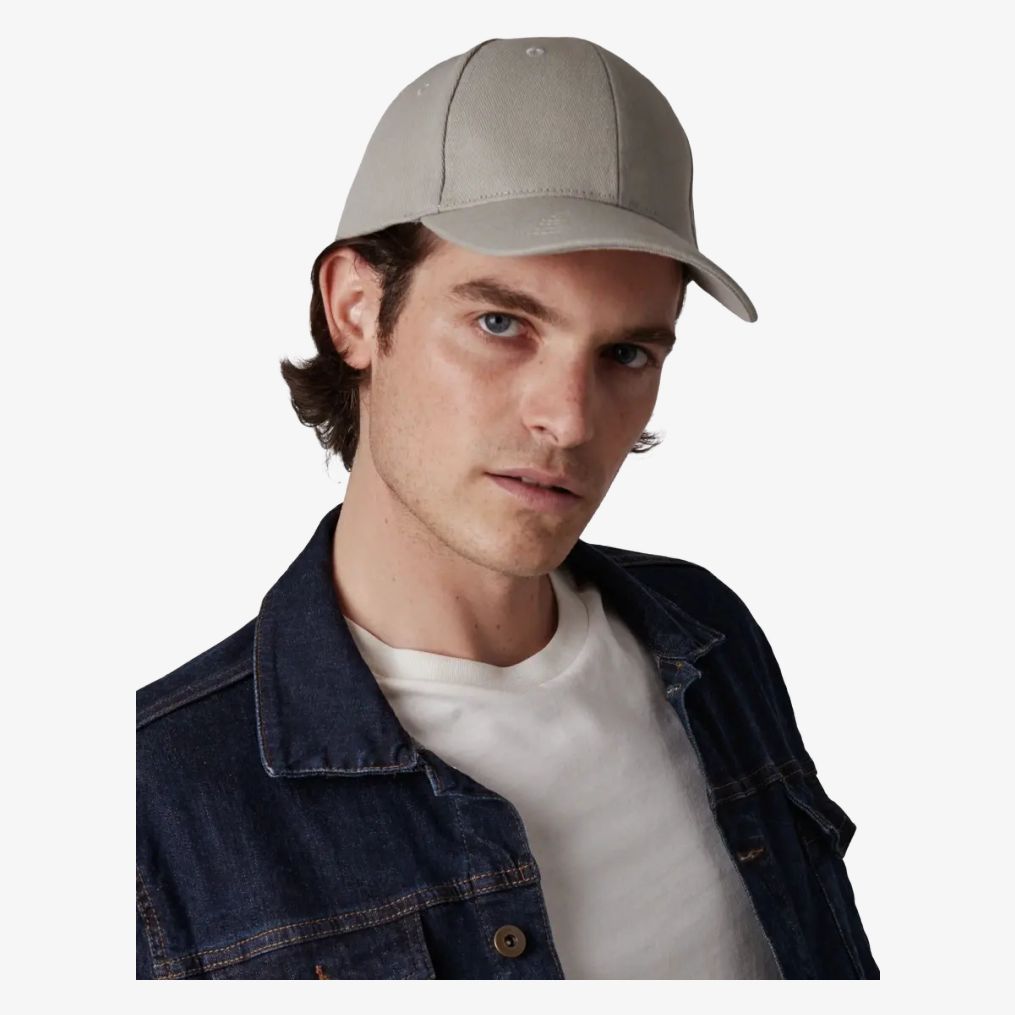 O boné 6 painéis em algodão sarjado reciclado e poliéster reciclado possui fechamento ajustável com fivela metálica trava automática.