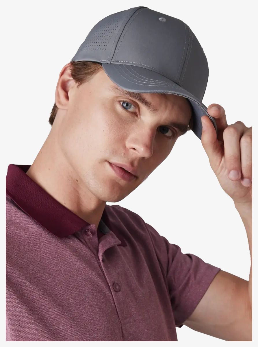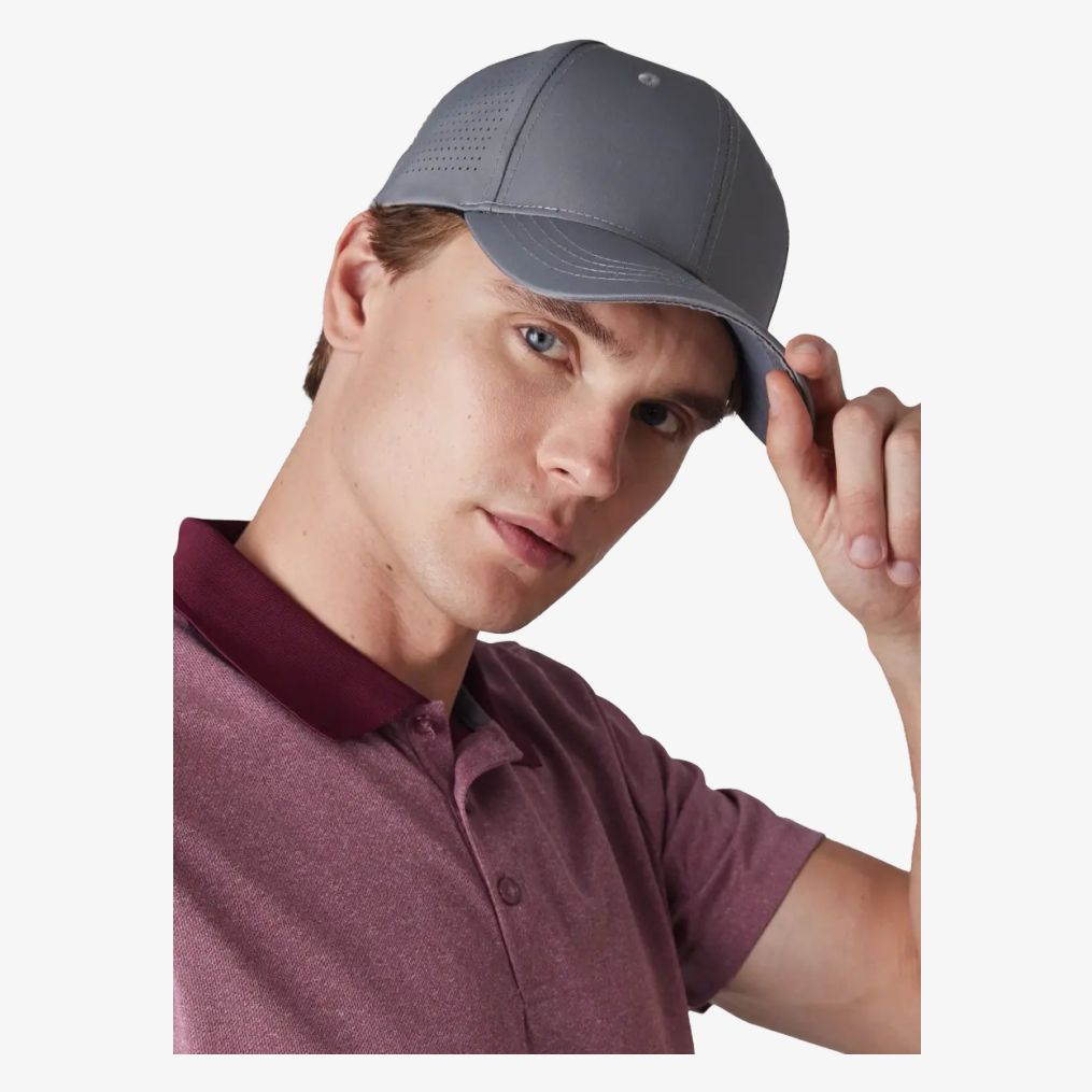 O boné microperfurado de 6 painéis possui 4 painéis traseiros microperfurados a laser que garantem ventilação. A pala curva protege os olhos, o fecho é por tira autoadesiva. Contém poliéster reciclado.