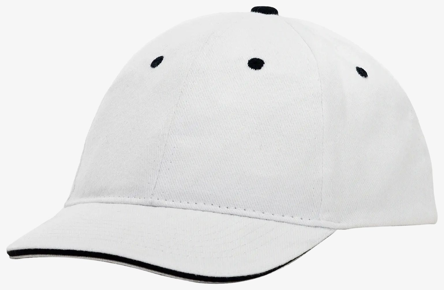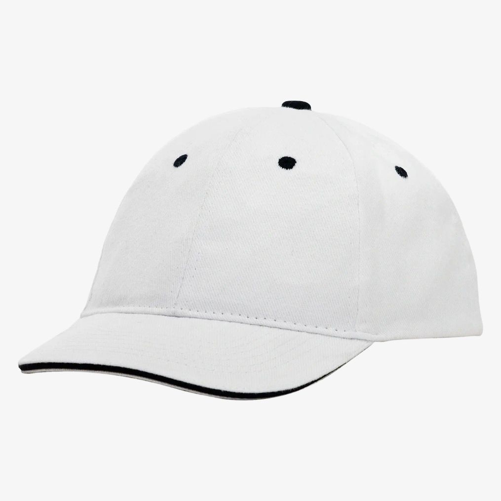 O boné de 6 painéis é feito 100% em algodão com sanduíche contrastante. Possui 6 ilhós de ventilação e fechamento com fita ajustável de velcro. Etiqueta removível.