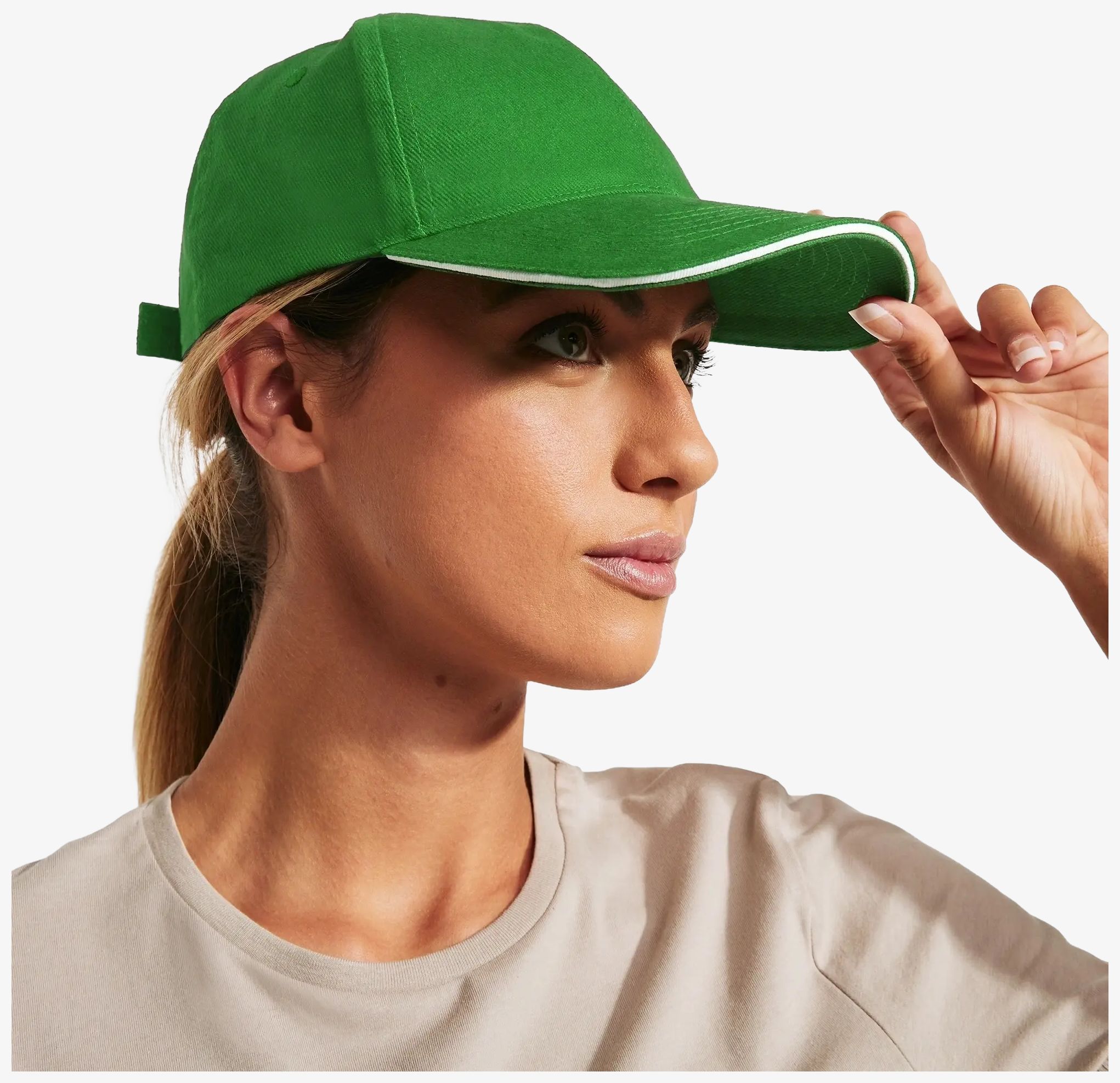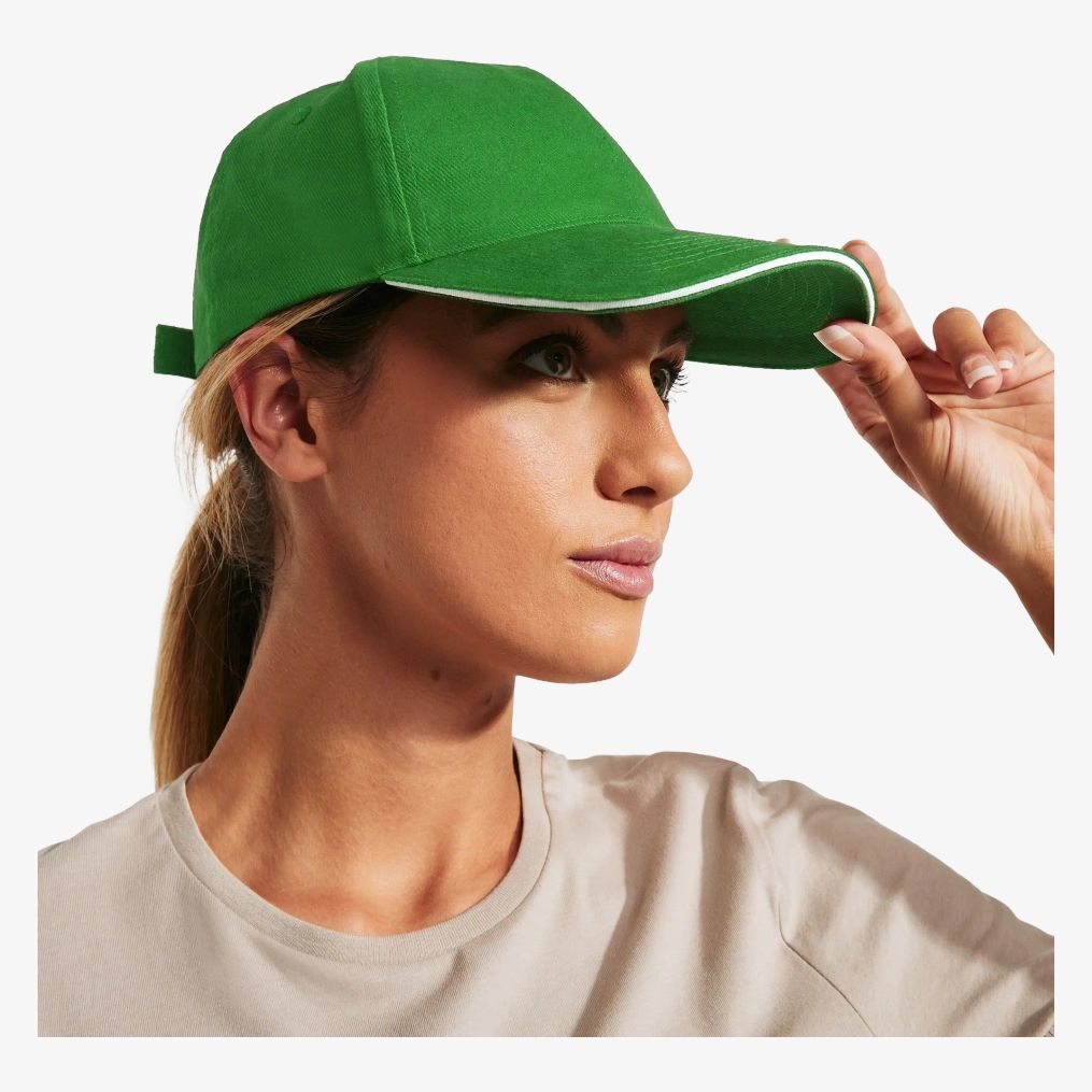 O boné ERIS é fabricado em 100% algodão com cinco painéis e um sanduíche contrastante. Inclui quatro ilhós bordados e uma faixa ajustável de velcro.