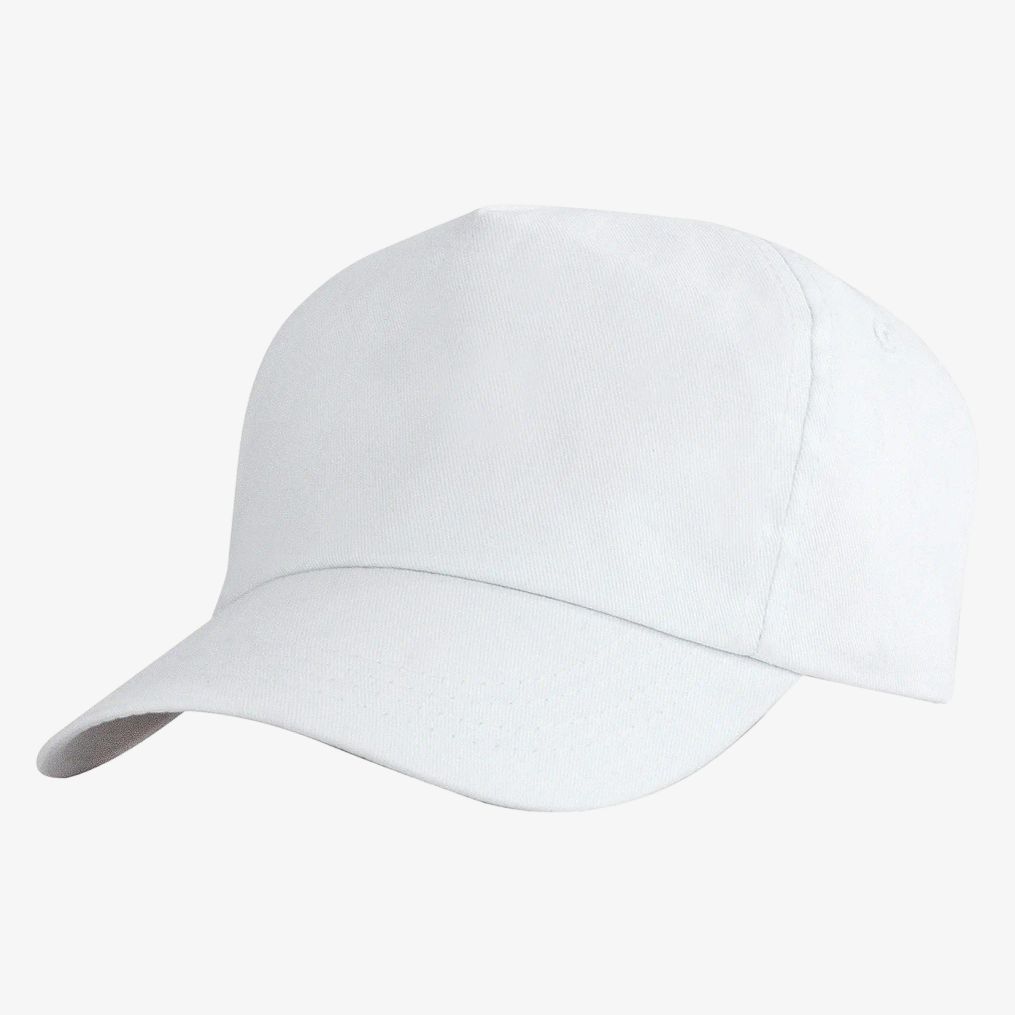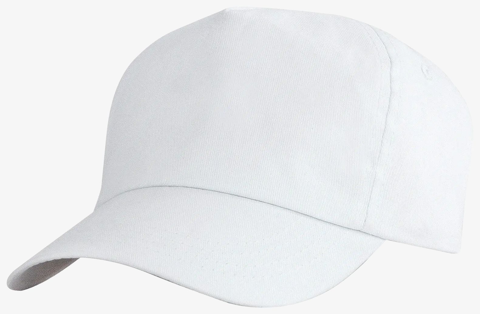 O boné 5 painéis é confeccionado em algodão com tira autoadesiva ajustável para regular o tamanho e ilhós para ventilação. A etiqueta é removível para maior flexibilidade.