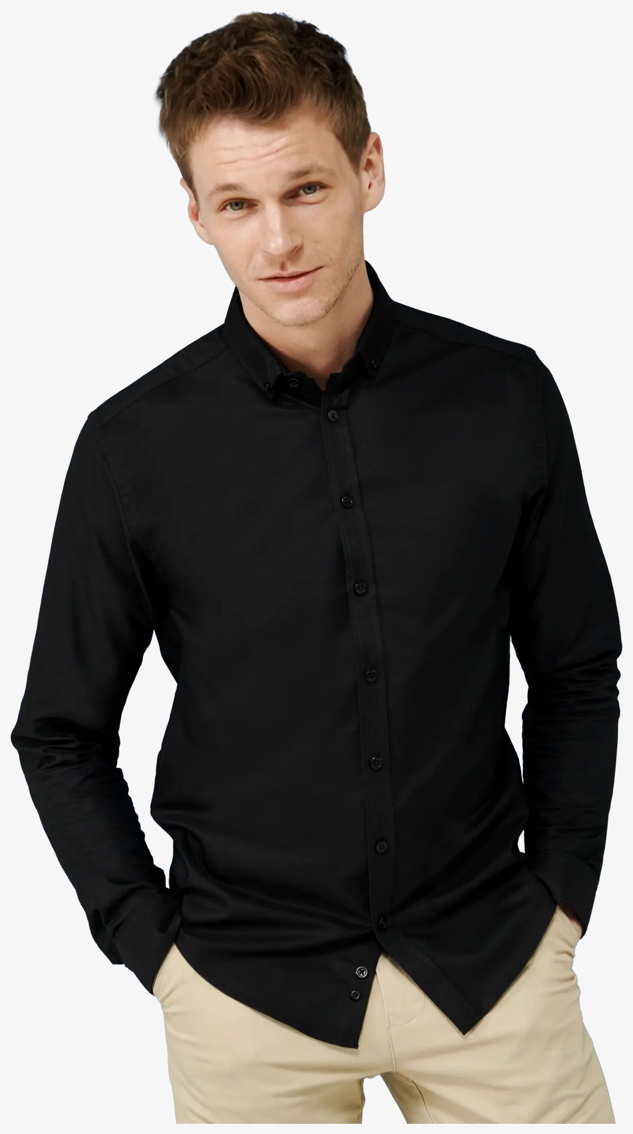 A camisa Oxford slim fit para homem é feita com corte justo e pregas nas costas. O tecido Oxford leve é sem amassados. Os botões são perolados.