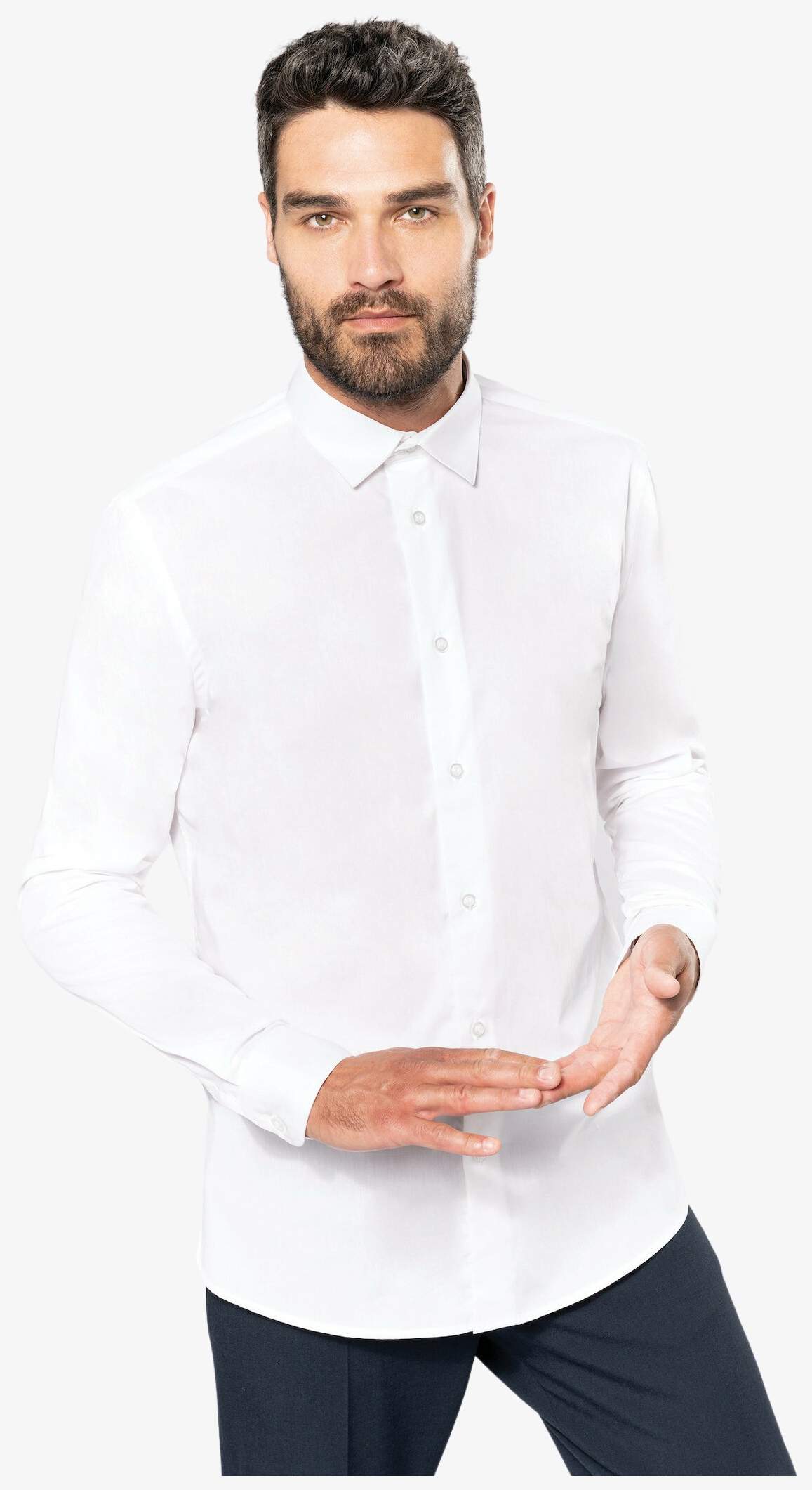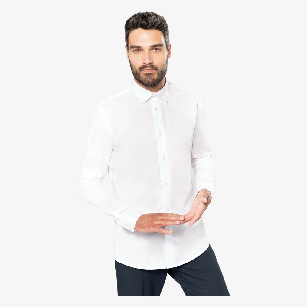 A camisa masculina de mangas compridas é feita em algodão popeline com tratamento Easy care para facilitar a manutenção. Seu corte é ajustado e apresenta botões tom sobre tom assim como pala nas costas.