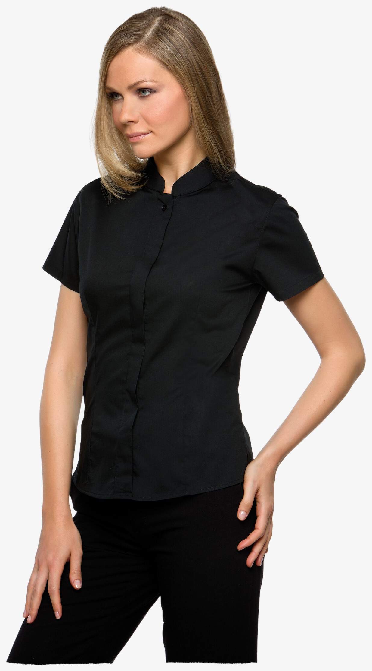 A Bargear Mandarin Shirt lady é uma camisa de manga curta com pequena gola direita e carcela de botões não aparente, com pences frontais, fendas laterais e base ligeiramente arredondada.