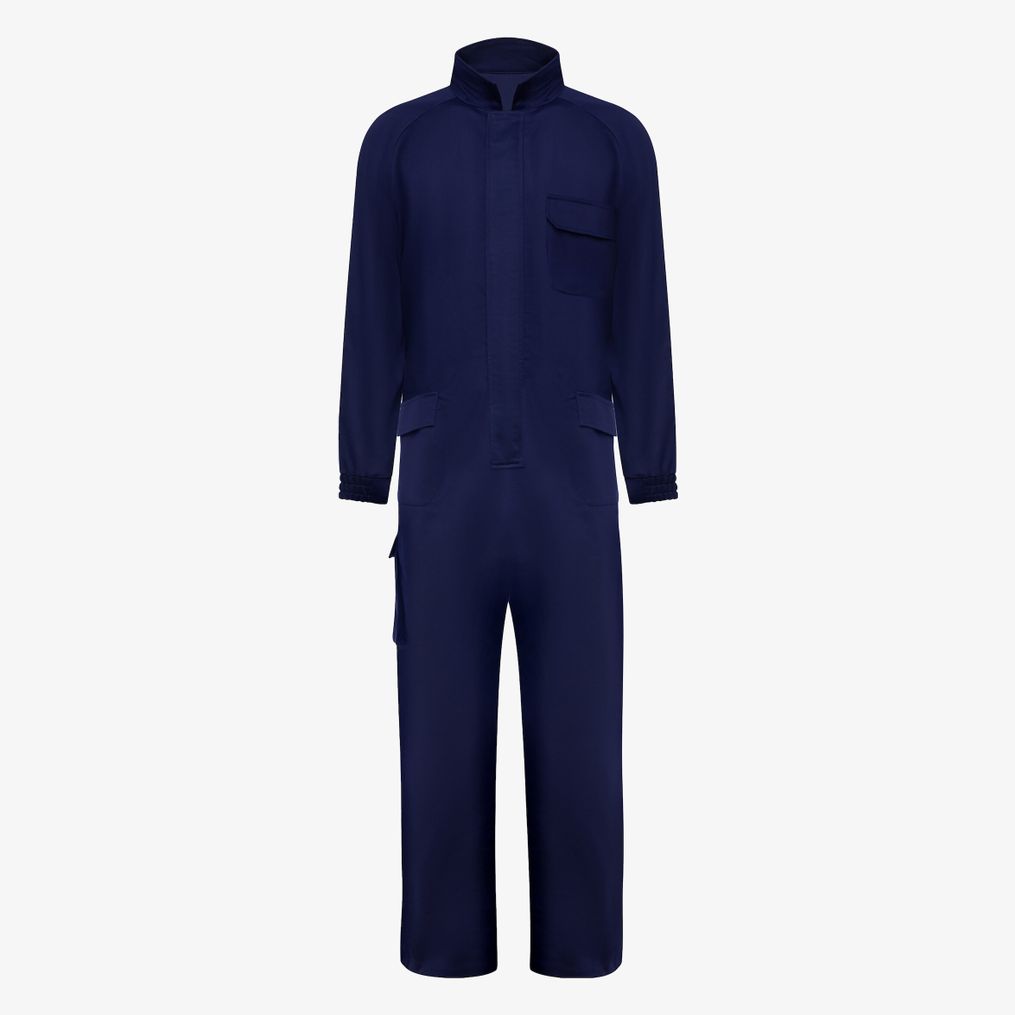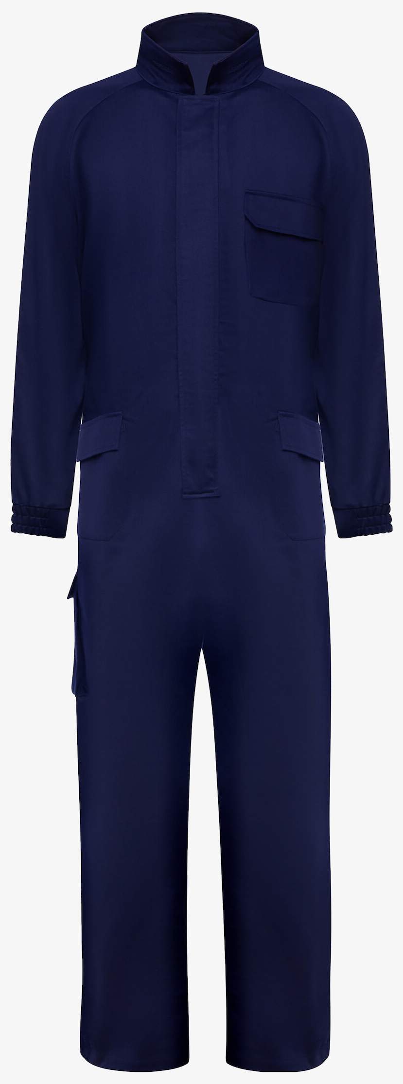O macacão reto em tecido sarja apresenta uma pala central com fecho de correr e faixa autoadesiva. Inclui um bolso no peito esquerdo, dois bolsos laterais, um bolso na perna e um bolso traseiro, todos com aba e faixa autoadesiva. Os punhos são reguláveis por faixa elástica. Este macacão integra proteções contra calor, chamas, riscos térmicos de arco elétrico e soldagem.