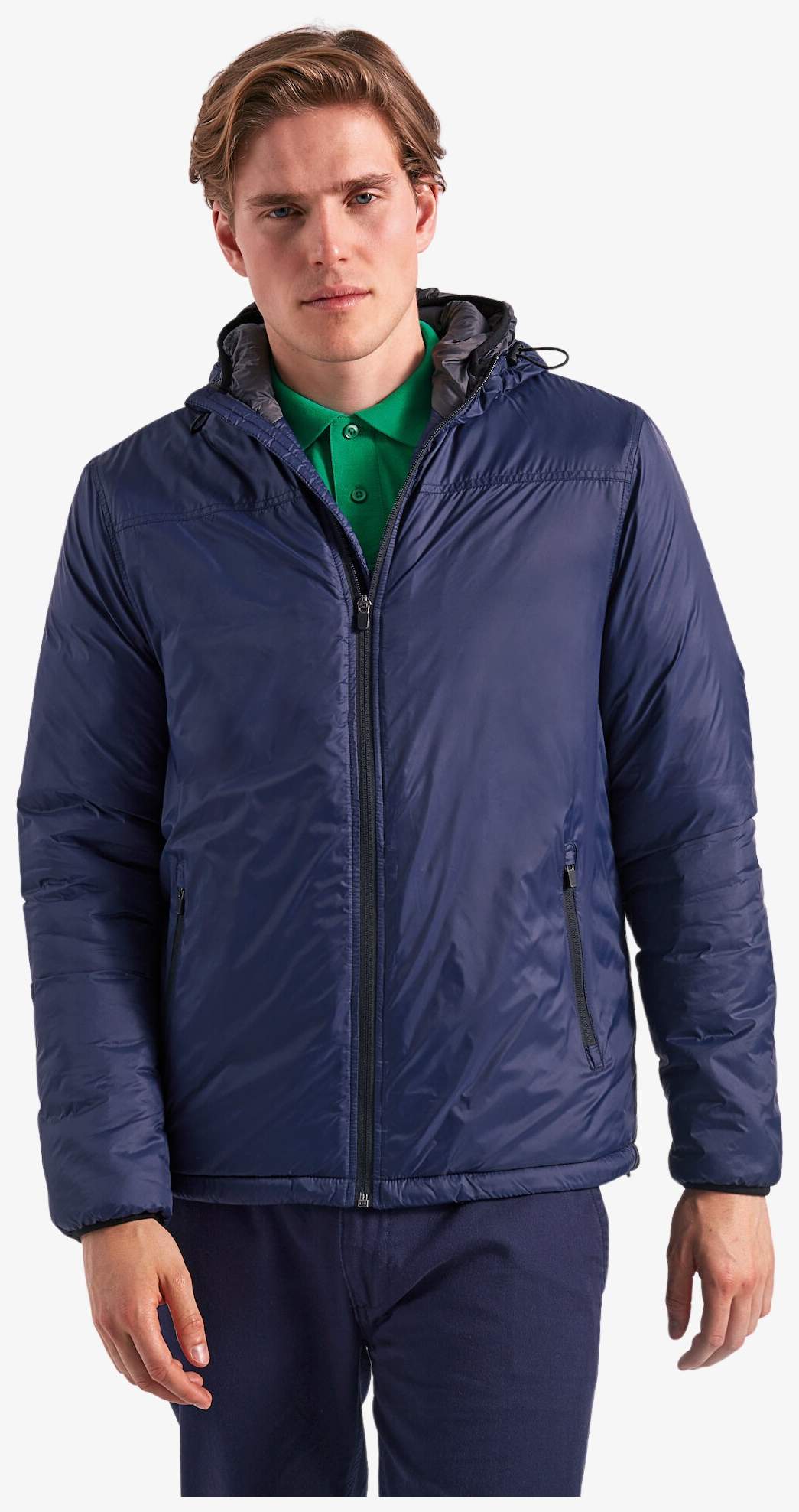 O casaco corta-vento acolchoado masculino é confeccionado com enchimento polyfill e superfície em poliéster. Inclui capuz duplo totalmente forrado com ajustadores, fecho de correr integral e dois bolsos frontais com fecho. Os punhos são elásticos para uma fixação adequada.