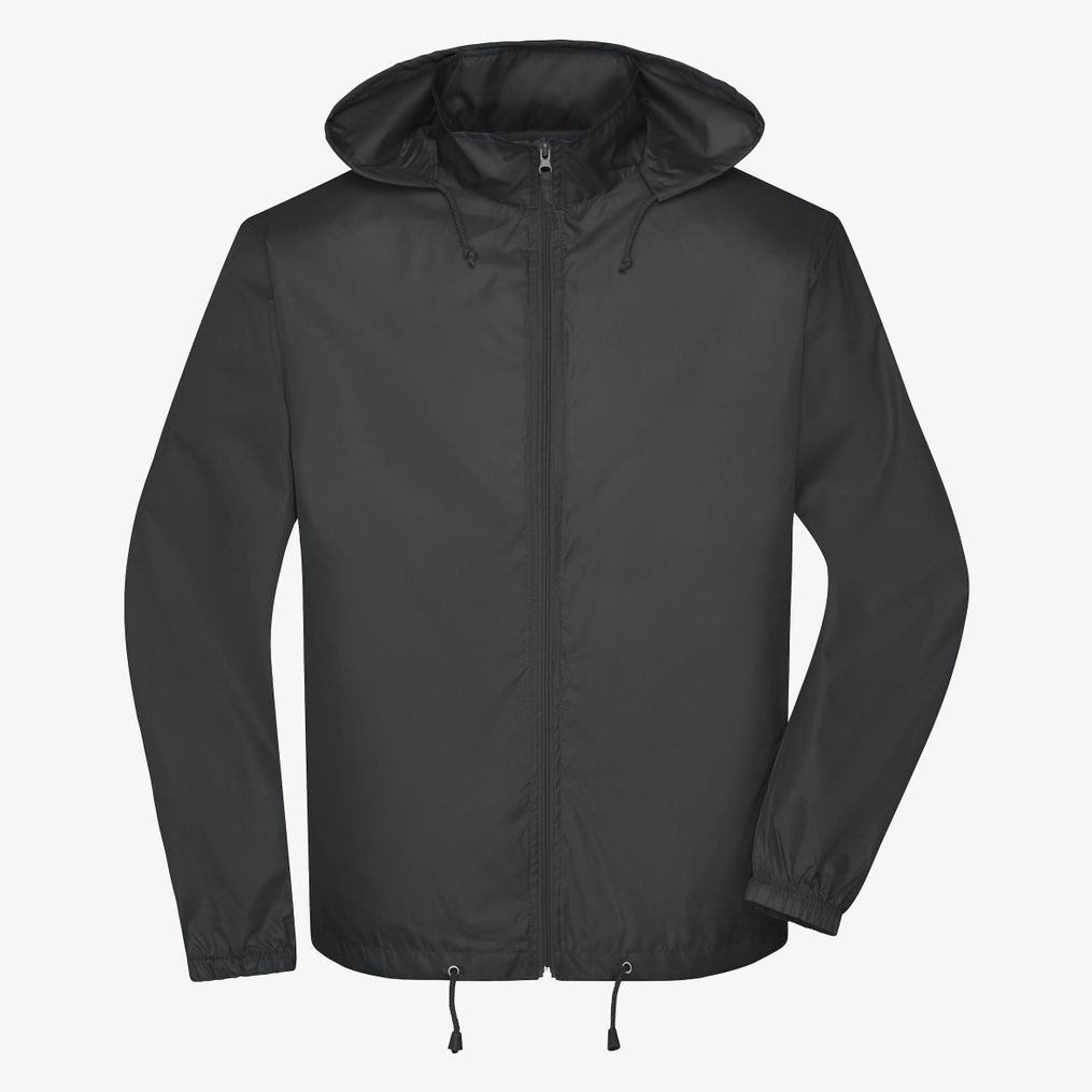 A jaqueta em tecido leve de poliéster possui revestimento corta-vento hidrorepelente com resistência à água de 600 mm. Inclui capuz integrado com cordão, cordão na bainha e dois bolsos laterais internos.