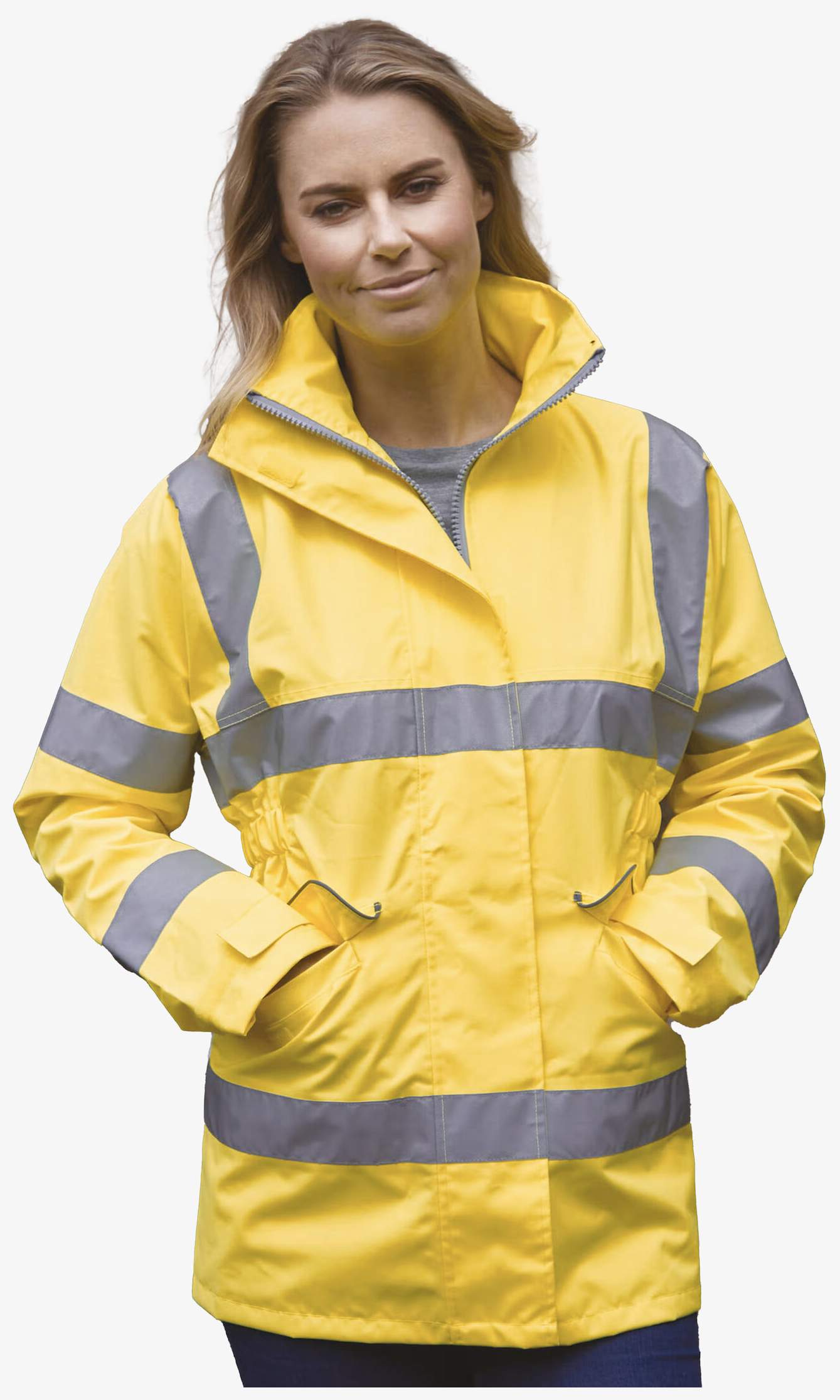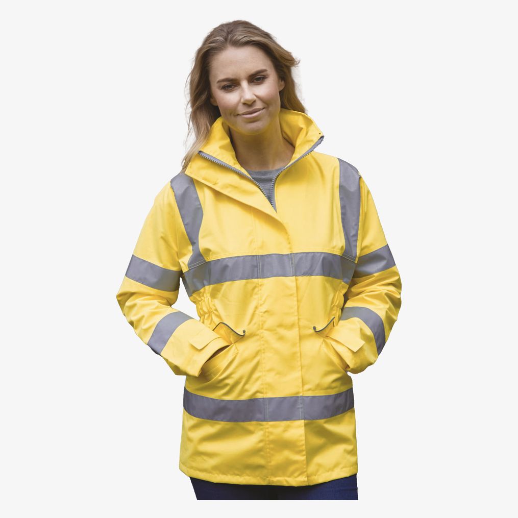 O casaco de alta visibilidade management feminino combina propriedades corta-vento e impermeável respirável com forro em malha filet tom sobre tom. Inclui capuz integrado na gola e fecho de correr duplo com aba de velcro. Os bolsos laterais sob aba possuem vivo refletor. O corte justo é semi-elástico na cintura.