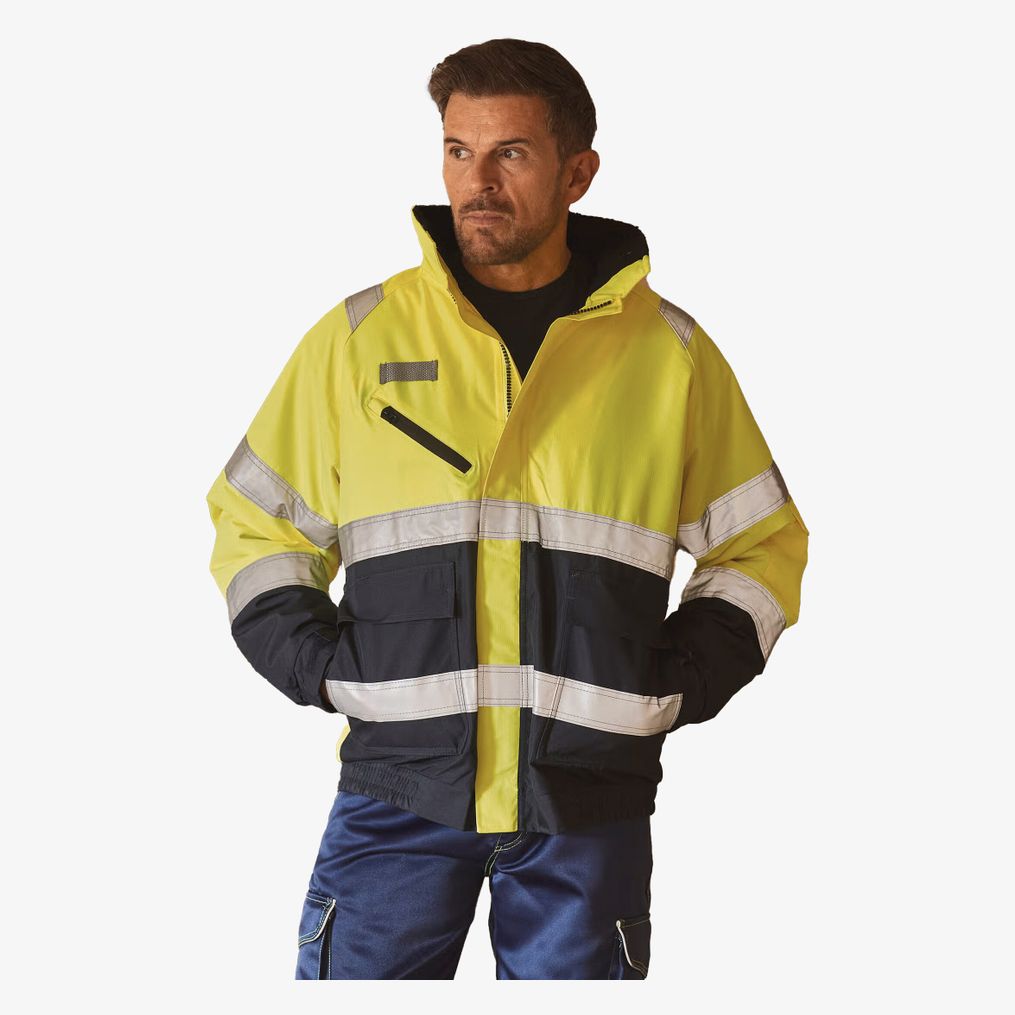 A jaqueta hi-vis em poliéster é feita com tecido rip-stop de quadrícula fina, impermeável e respirável. Inclui forro removível em lã polar Sherpa e várias fitas retrorefletoras costuradas ao redor do corpo e braços para melhor visibilidade. A jaqueta possui capuz removível, bolso impermeável no peito com fechamento autoadesivo e bolsos no braço esquerdo adaptados para caneta e telefone móvel.