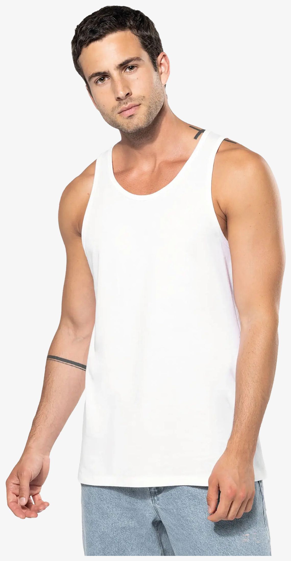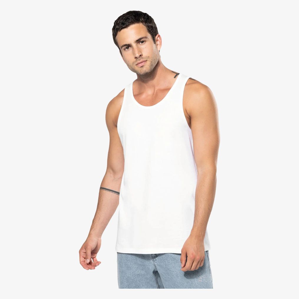 O débardeur écoresponsable homme é confeccionado em algodão de conversão biológica com malha jersey. Apresenta corte ajustado e gola redonda com viés tom sobre tom. A barra é finalizada com costuras duplas. Sem etiqueta na gola, apenas uma tag de tamanho para facilitar o uso.