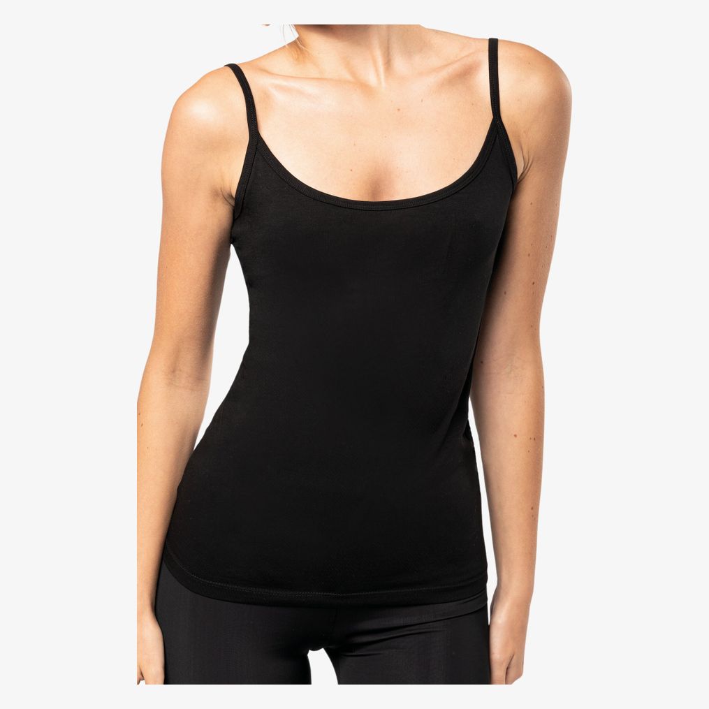 O débardeur à bretelles femme é feito em malha jersey de algodão penteado composta por 95% algodão e 5% elastano. Apresenta um corte feminino com alças finas e acabamento em viés estreito no decote. A base é com dupla costura.