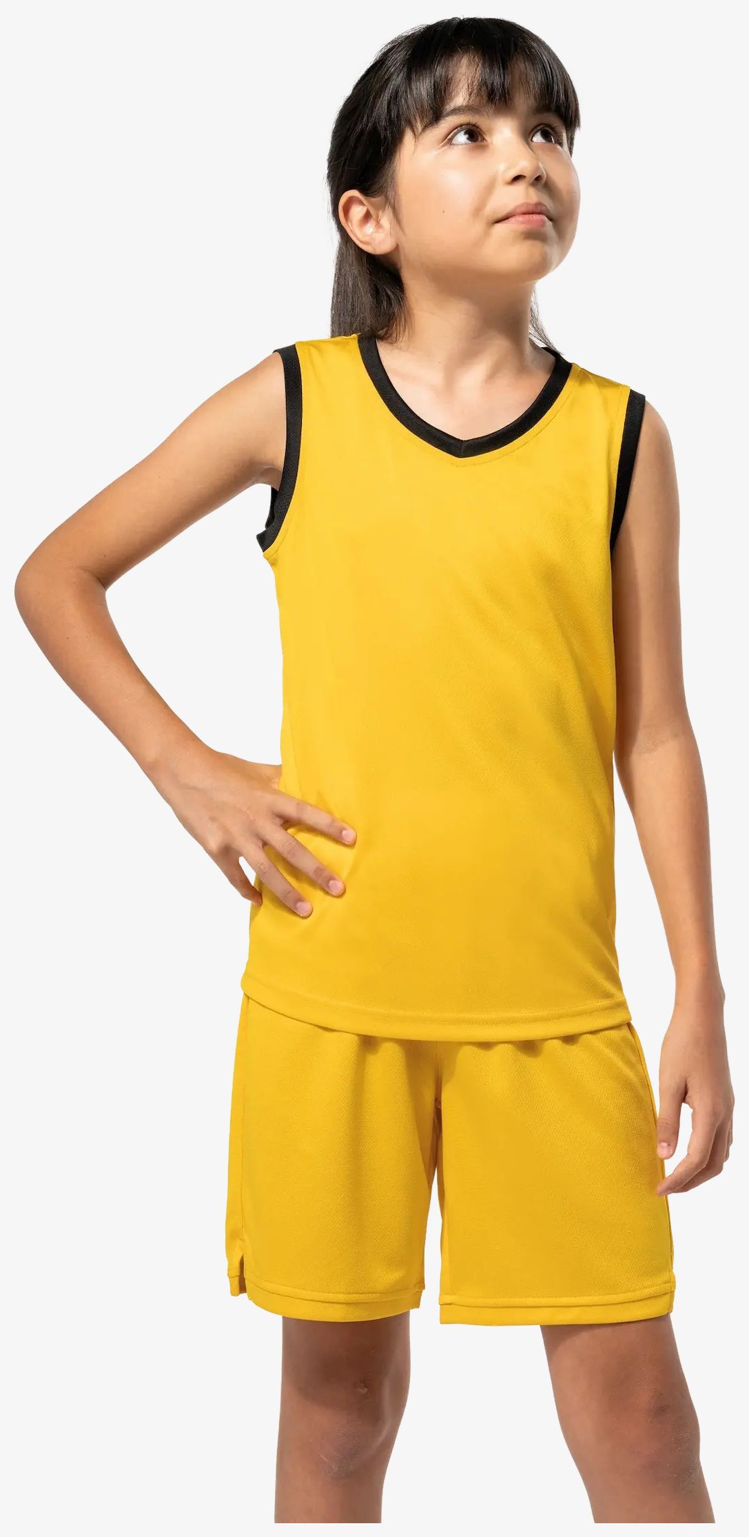 O maillot basket-ball enfant em poliéster birdseye é feito com tecido microarejado que favorece a respirabilidade. Possui decote em V e viés contrastante no colar e nas cavas. Apresenta tratamento antiestático. O acabamento é com costura dupla na barra.