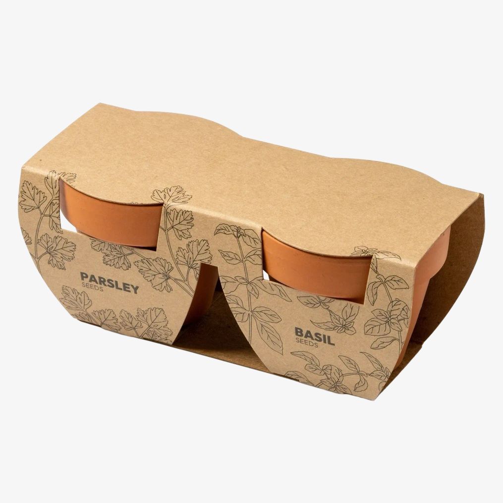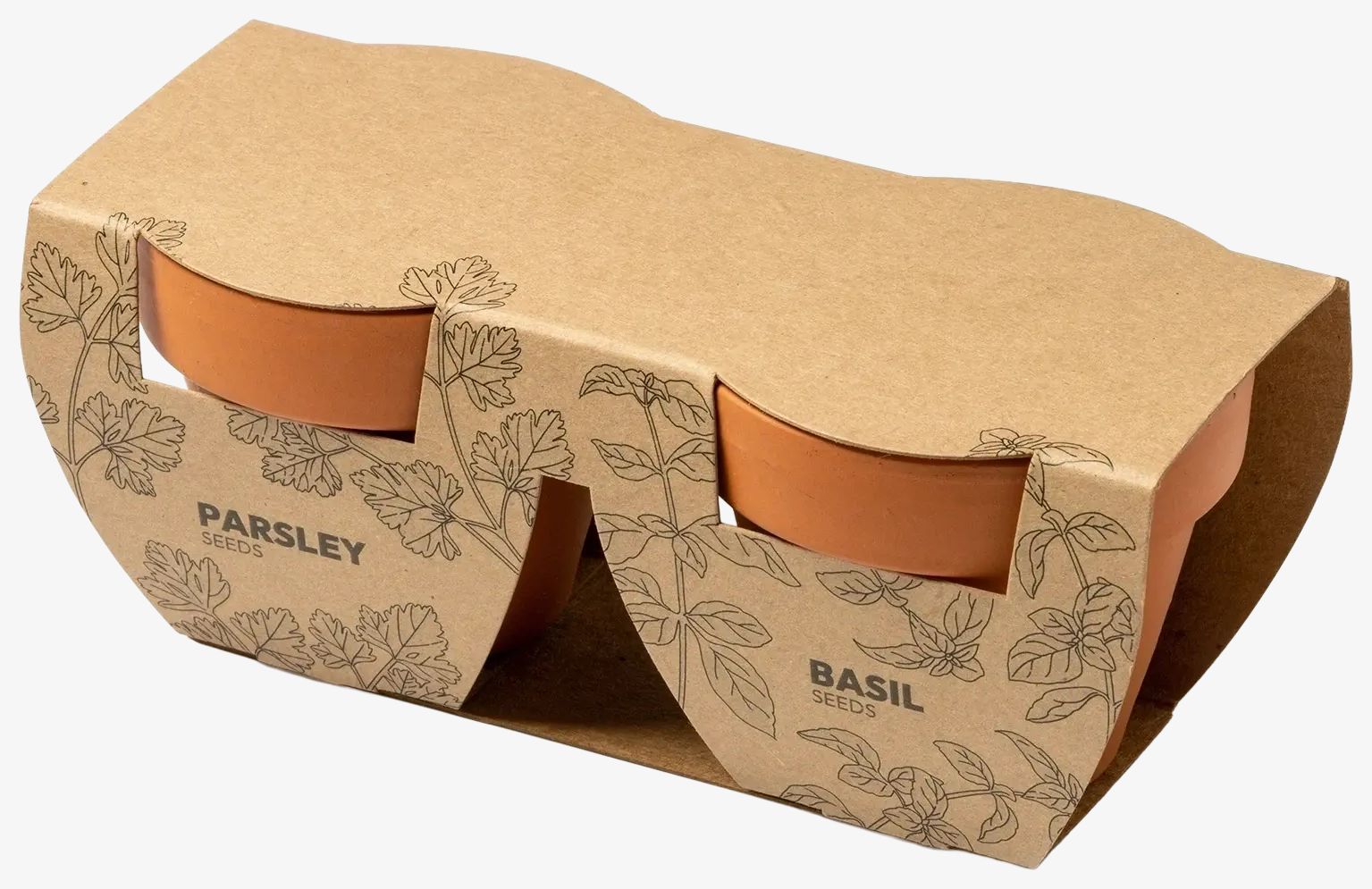 O conjunto de vasos inclui dois recipientes acompanhados de sementes de manjericão e salsa, bem como o substrato necessário para o crescimento.