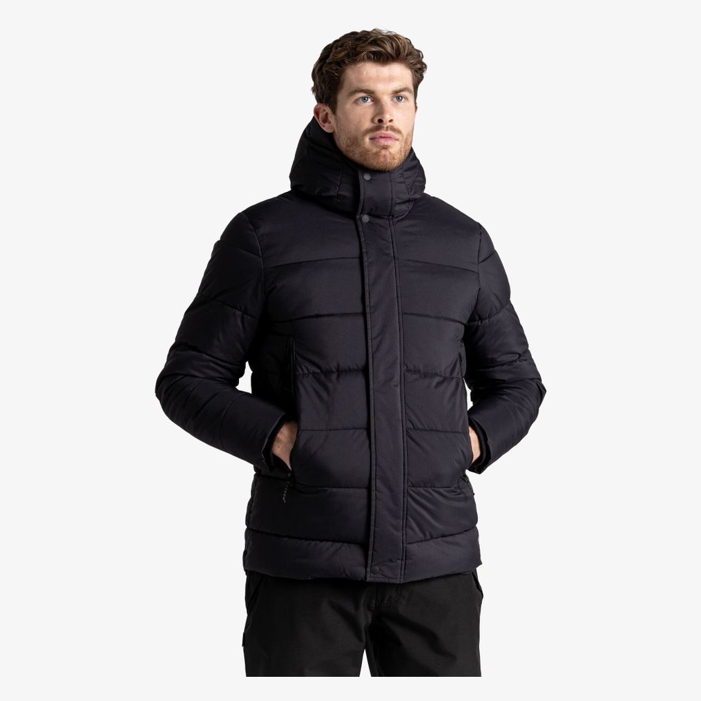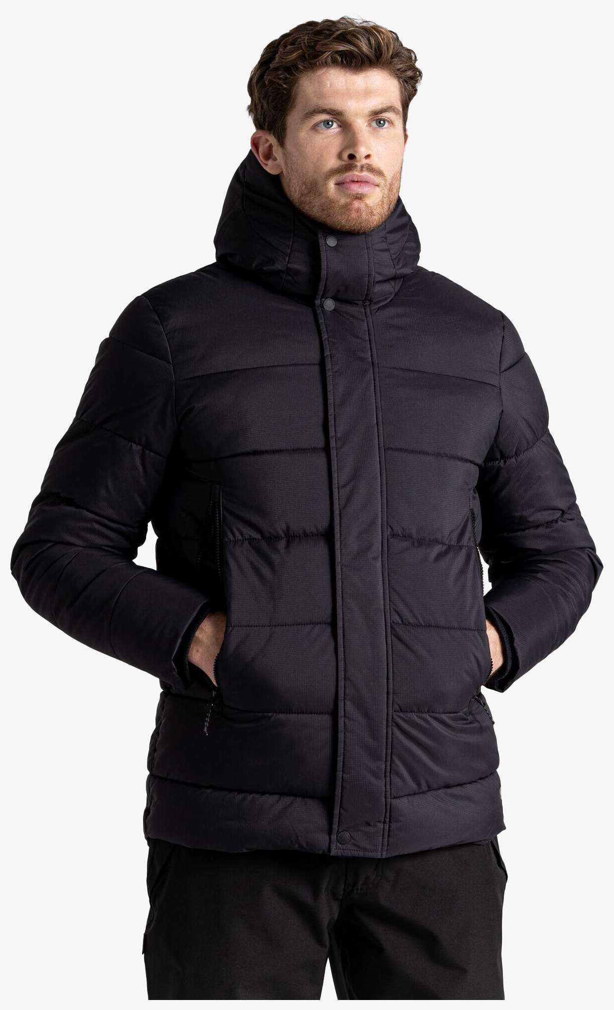 O casaco acolchoado é concebido com acabamento repelente EcoShield DWR e integra patches anti-odor. Possui 4 bolsos, incluindo um com segurança RFID, proteção para queixo e fecho frontal com cursor. Cerca de 500g de materiais reciclados são usados por peça.