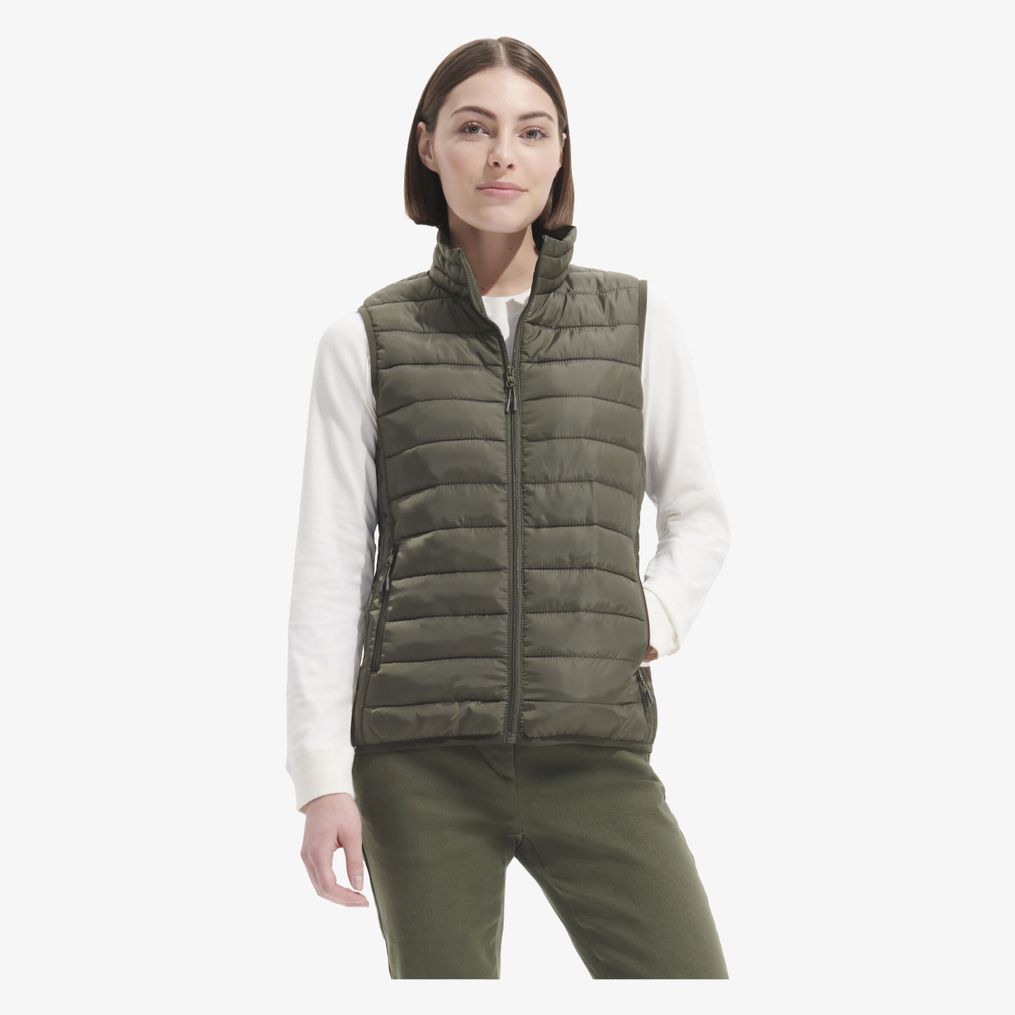 O colete leve sem mangas feminino caracteriza-se por uma abertura principal e bolsos laterais com zíper em náilon tom sobre tom. Possui gola alta e parte inferior com cavas acabadas com viés elástico tom sobre tom. Acompanha um saco para armazenamento.