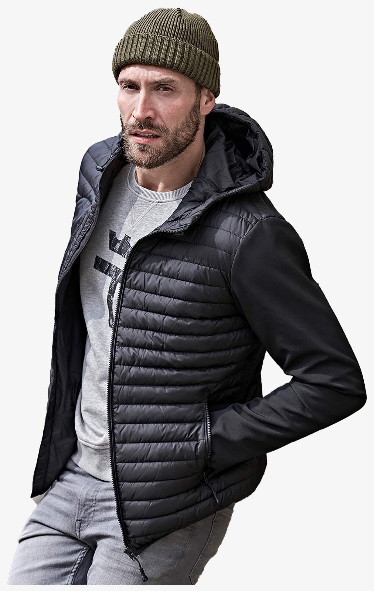 O casaco bimatéria masculino combina poliéster matelassê softshell e poliéster 300T com enchimento de poliéster. Possui capuz ajustável, bolso no peito com zíper, dois grandes bolsos frontais e bolso interno. A cintura é ajustável e os punhos são elásticos.