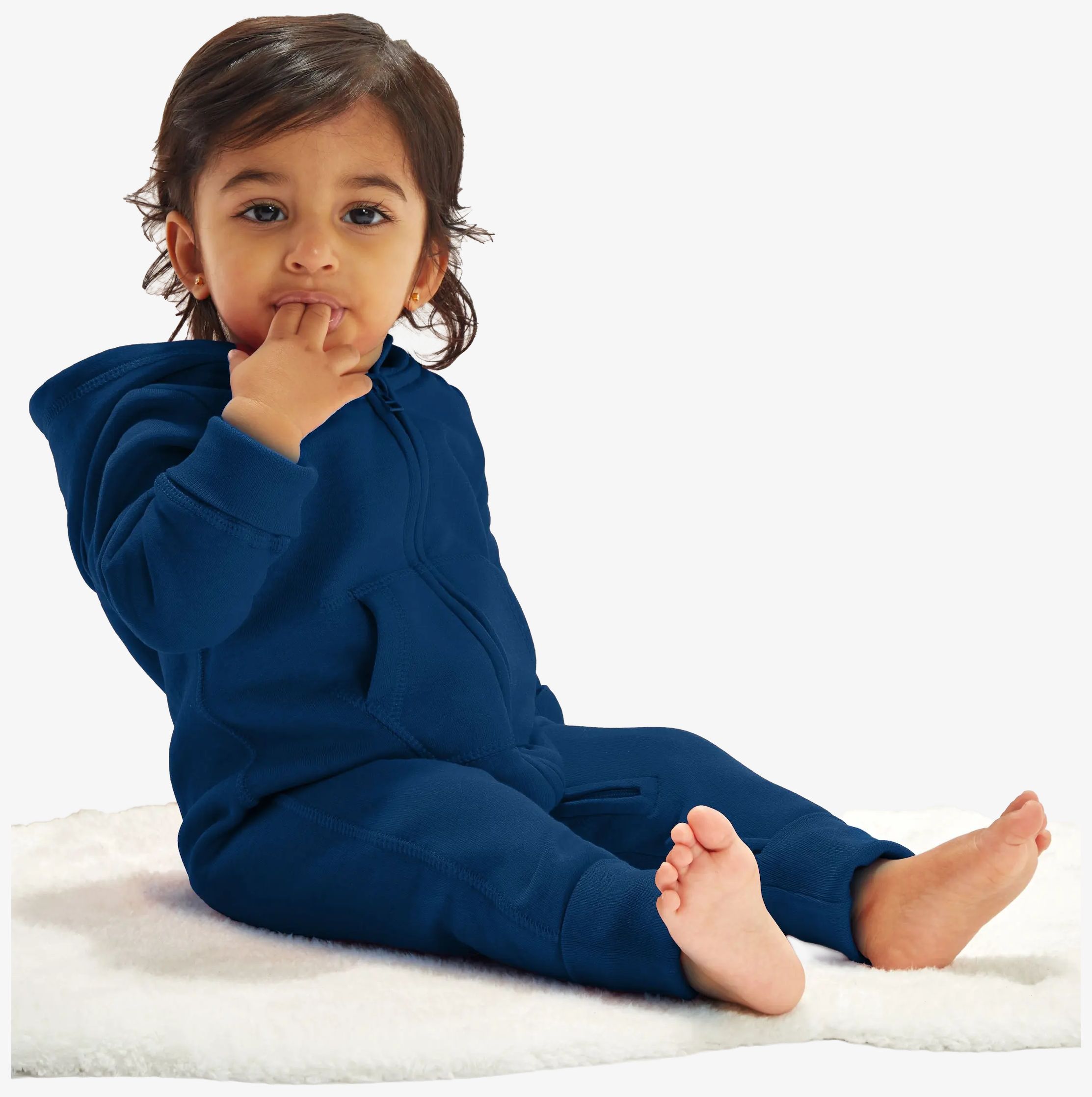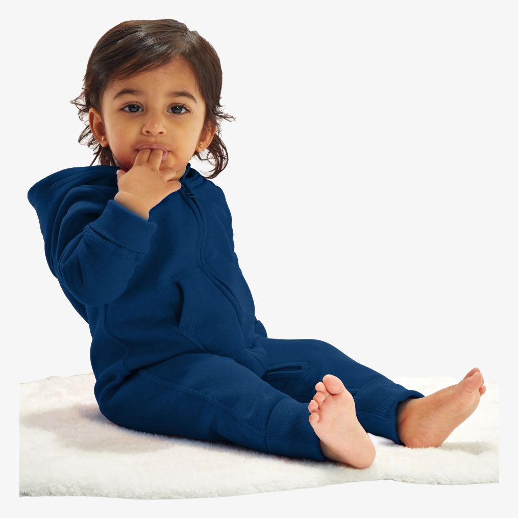 O macacão com capuz para bebé inclui interior em polar e fecho éclair frontal. Integra um bolso canguru e costuras planas para melhorar o conforto. Uma etiqueta removível facilita a troca de marca.