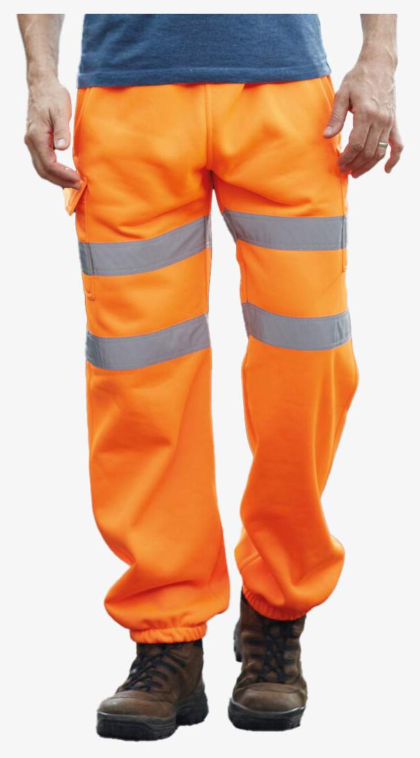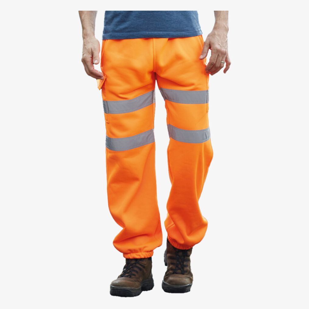 O pantalon jogging possui cintura totalmente elástica com cordão de ajuste. Apresenta duas faixas retrorefletoras de 5 cm de largura na parte superior da coxa. O bolso cargo tem aba fechada por tira adesiva. O tornozelo também é elástico.