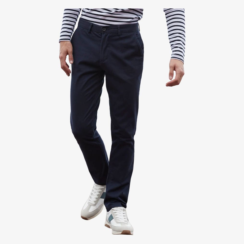 O chino leve masculino é uma calça stretch masculina sem prega na frente, equipada com dois bolsos traseiros com vivo e passadores para cinto. O fecho é com zíper e botão no cós, a barra é simples. A composição é 97 % algodão e 3 % elastano.