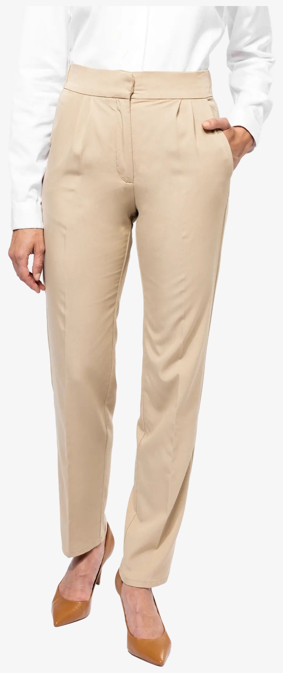 A calça feminina é confeccionada em tecido twill com composição de 68% viscose, 29% poliéster, 3% elastano. Inclui dois bolsos italianos frontais e dois bolsos traseiros encobertos falsos. O zíper é de nylon, com dois ganchos de metal e um botão sob aba. O cós traseiro é elástico para maior conforto.