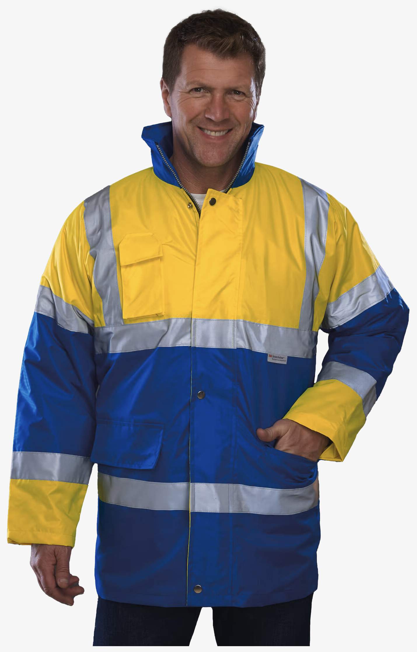 O casaco impermeável corta-vento com cores contrastantes garante maior visibilidade para o pessoal em exterior. Possui vários bolsos para guardar objetos úteis durante atividades profissionais regulares.