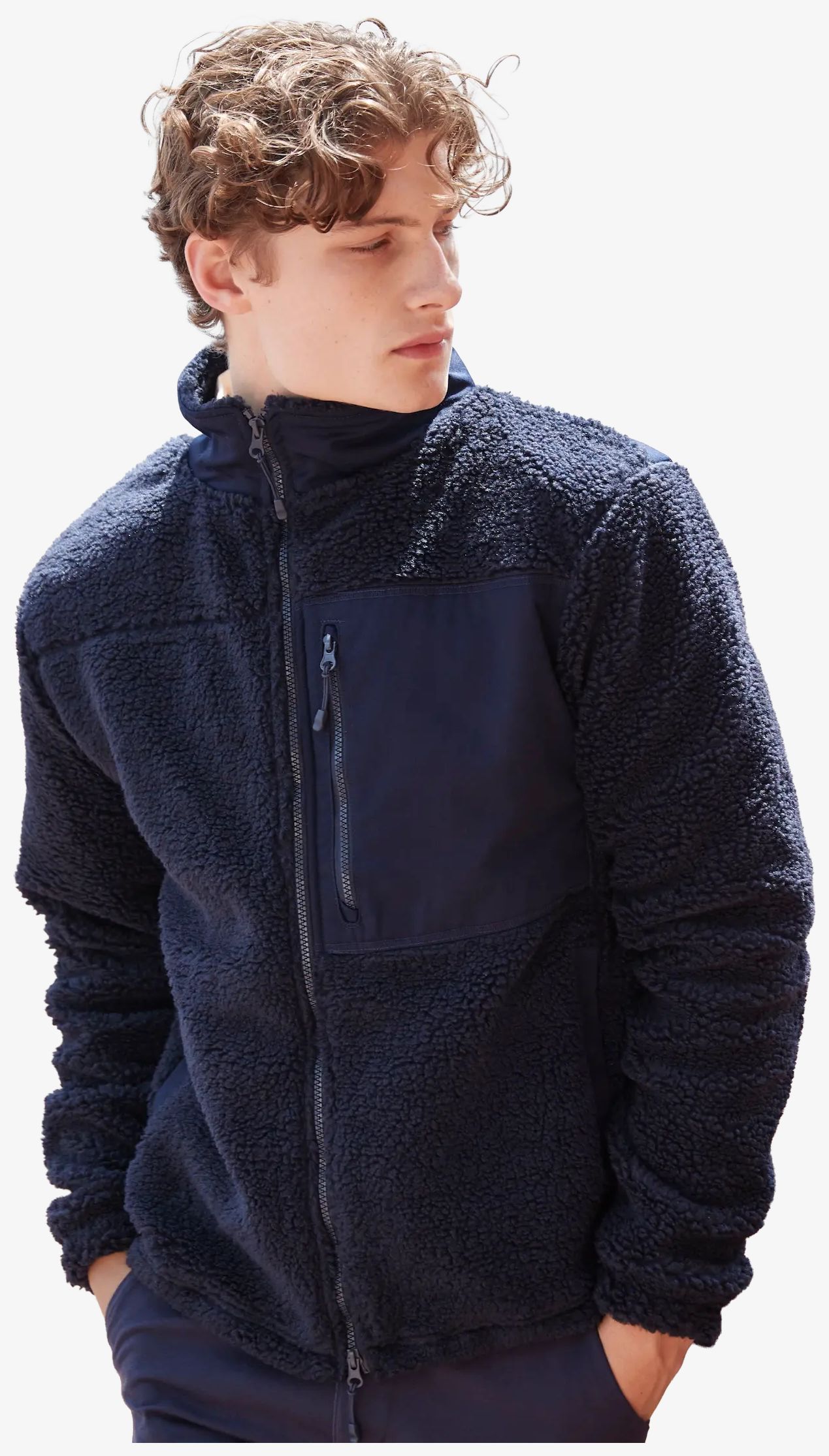 O sherpa reciclado inclui bolso frontal com zíper no peito e bolsos laterais com aba e fechamento por botões de pressão. A gola alta e o forro em sherpa proporcionam estrutura adequada. Punhos elásticos e barra curva com cordão garantem ajuste.