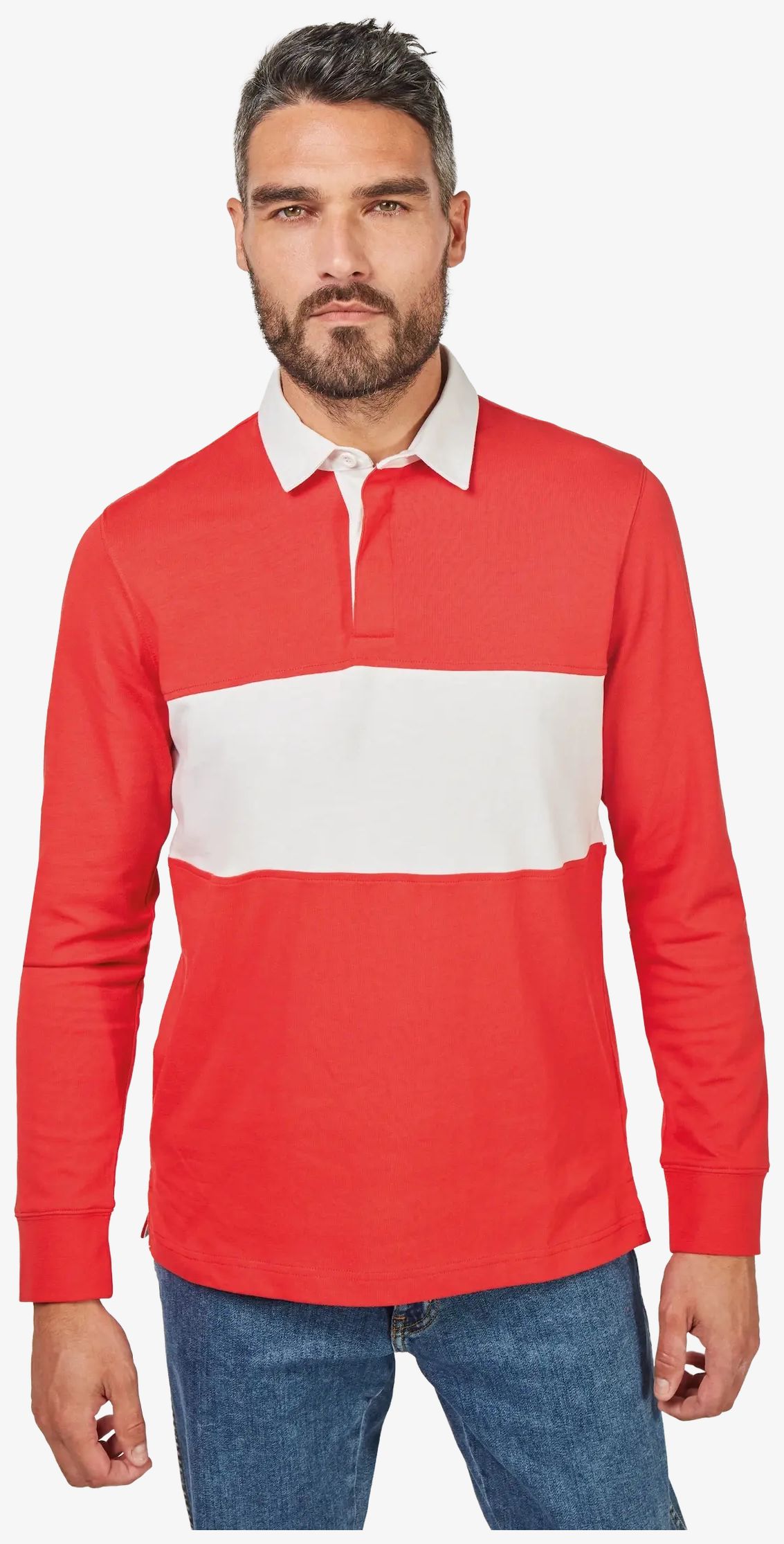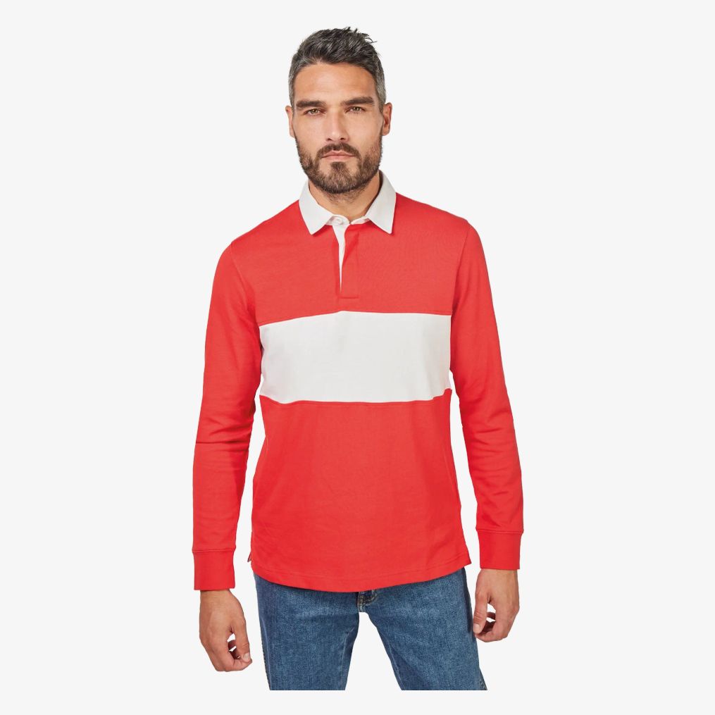 O polo rugby mangas compridas pa429 é feito em tecido jersey para conforto ideal com corte reto que facilita a liberdade de movimento. Possui gola interna em algodão sarja branco, pala com 3 botões de borracha, punhos em malha canelada 1 x 1 e fita de acabamento na gola em espinha tom sobre tom. Uma faixa central contrastante está presente na frente e nas costas assim como aberturas laterais com fita em espinha tom sobre tom. Costuras duplas são aplicadas nas cavas, punhos e barra da peça. A etiqueta de marca é destacável.
