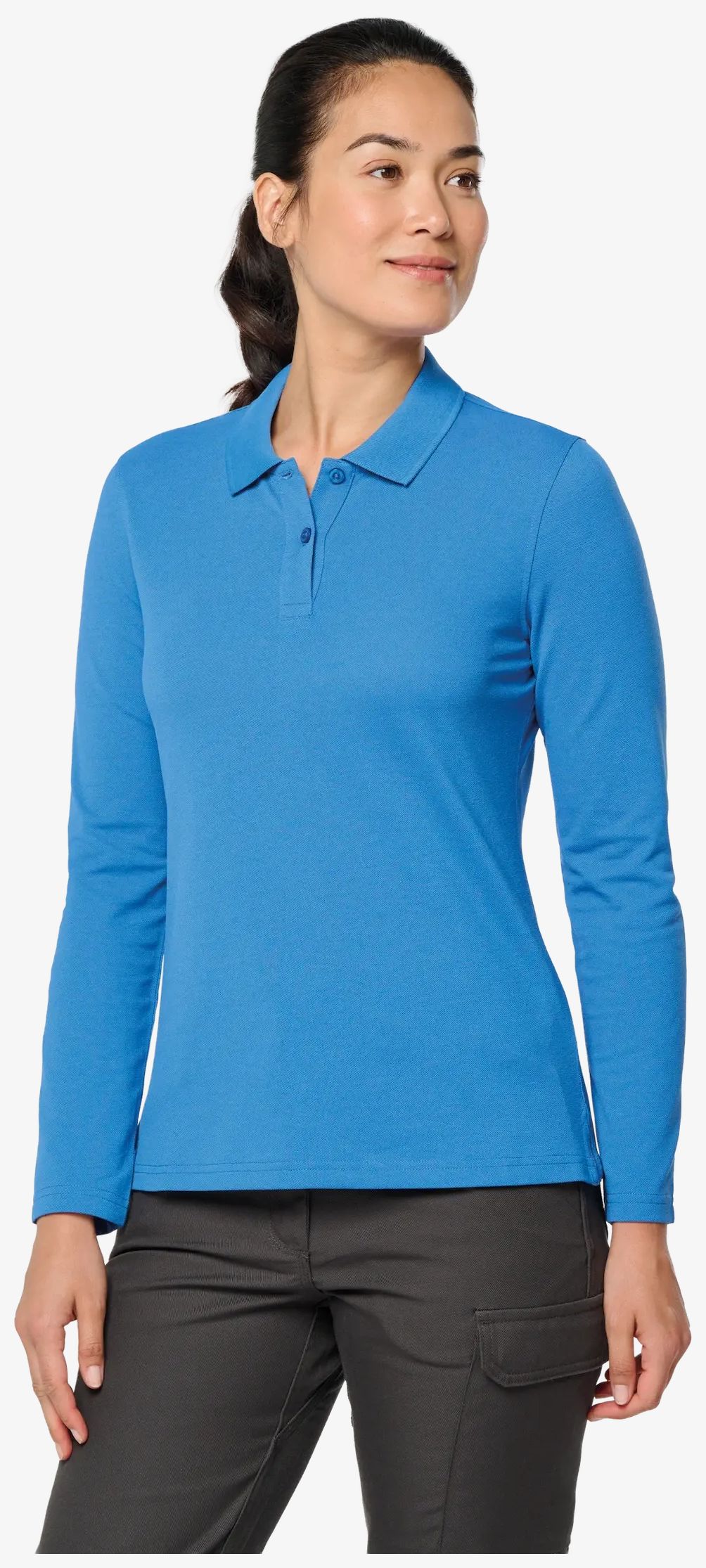 O polo de manga comprida feminina é fabricado em algodão penteado malha piquê com tratamento antibacteriano anti-bolinhas. Inclui pala de colarinho com 2 botões tom sobre tom, colarinho canelado com fita de limpeza contrastante e fendas laterais com fita contrastante para maior conforto.