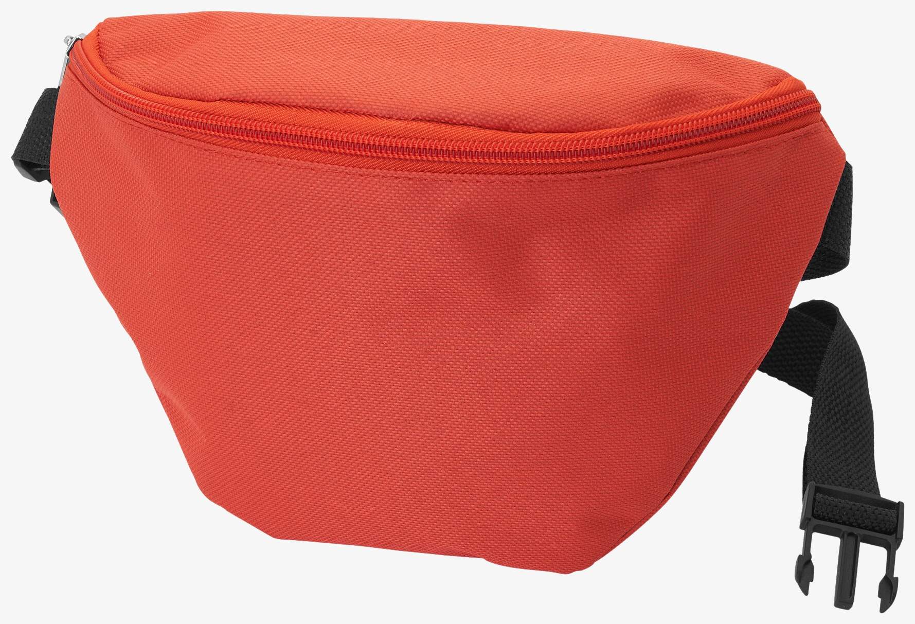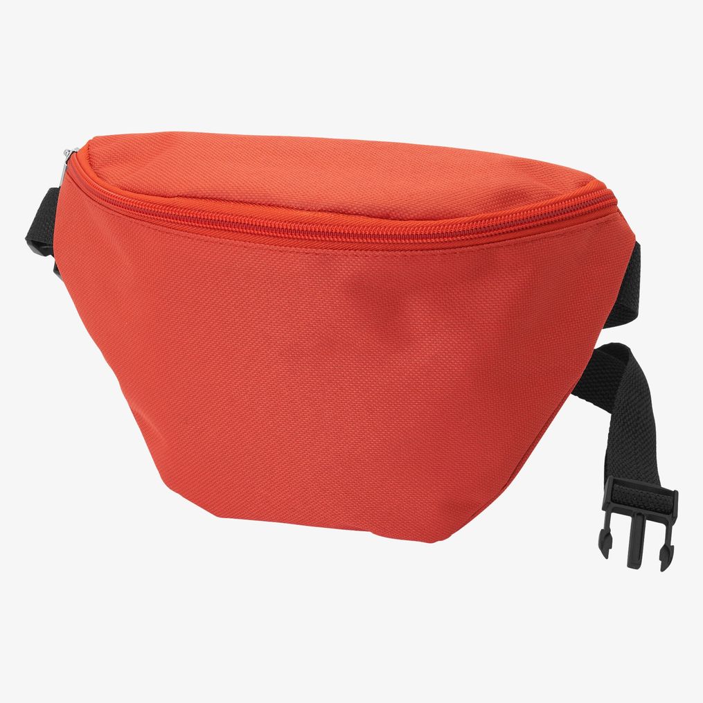 A pochete em poliéster 600D inclui um bolso dianteiro e um bolso traseiro com fecho de correr correspondente. O cinto tem uma fivela de ajuste preta.